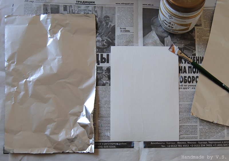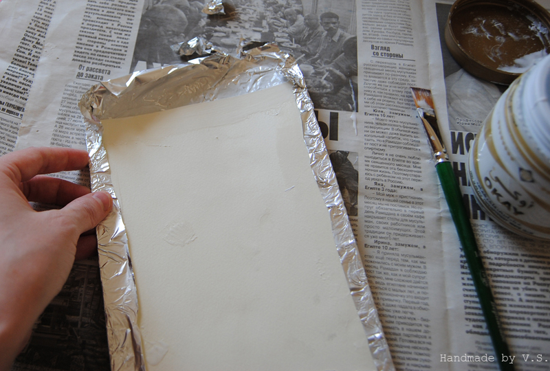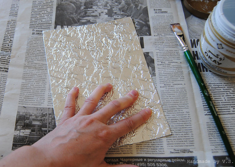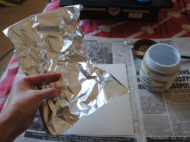 Немного сминаем лист фольги и прикладываем к смазанной клеем основе.