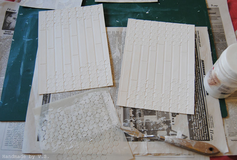 Покрываем "паркет" слоем белого акрила с помощью кисти, стараясь не забивать плотно рытвинки-полосочки текстурного картона, и откладываем и эти листы сушиться.