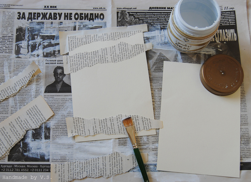 Нарвав на неровные кусочки книжные страницы, приклеиваем их к фону. В первом случае работы с обрывками книжных страничек я применила резиновый клей.