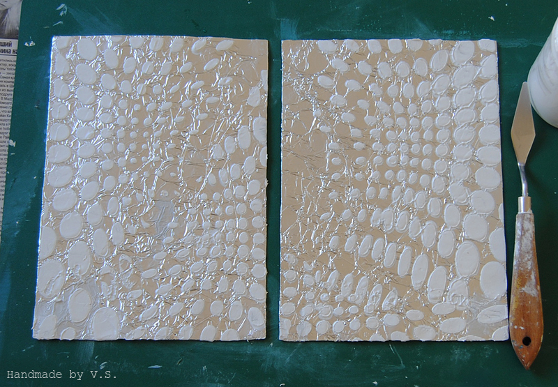 Если вы не хотите ждать просушки после каждого нанесения пасты, будьте внимательны и не разрушьте уже созданный рельеф. Вот тут на левой страничке мне пришлось удалять размазавшиеся от соприкосновения с пластиком уже нанесённые, но не высохшие окружности и добавлять новые. Фольга в районе этих "аварий" приобрела белый цвет, но для нашей дальнейшей работы это не будет иметь никакого значения.