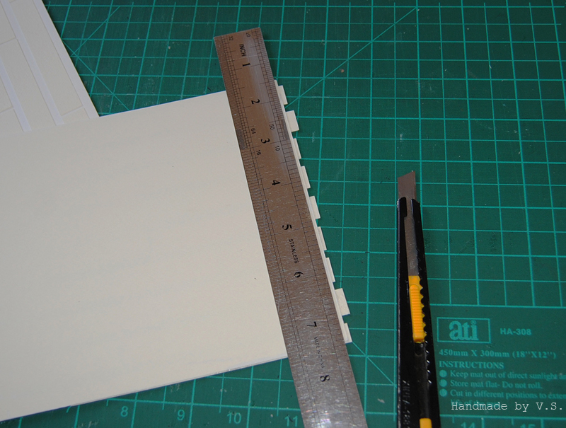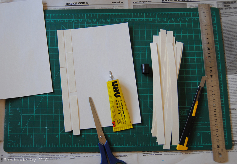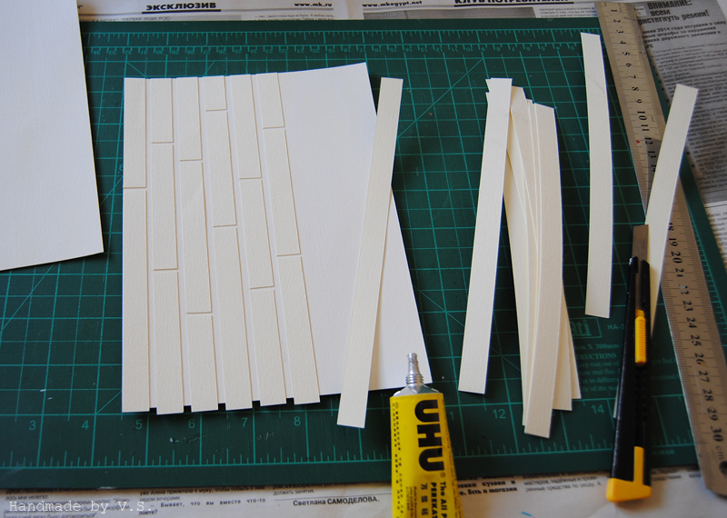 На макетном коврике отрезаем по разметке полоски шириной примерно 1см (у кого коврика нет - делаем разметку каранадашом и по 1см полосочки отрезаем).