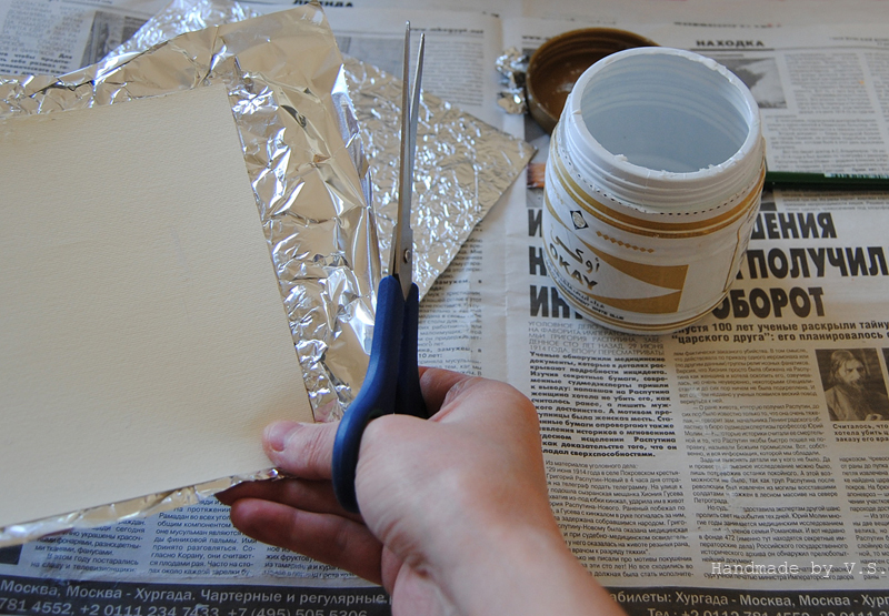 На уголках (и где ещё явно лишнее) обрываем фольгу.