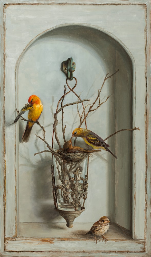 Мэри Кей Уэст родилась в 1954 году в Ашвилле, Северная Каролина. Мэри Кэй является дочерью профессионального акварелиста Элизабет Филлипс.Мэри Кей . С самого раннего возраста её поощряли в стремлении проявить свою творческую и художественную натуру, и она начала рисовать под руководством своей матери, художницы-акварелистки. Но другие интересы — психология и восточная философия — привели её к карьере в области клинической и педагогической психологии, а затем к преподаванию йоги и йогатерапии. Только в 2003 году началась её жизнь как художницы, когда она поступила в Лигу изящных искусств Эшвилла к мастерам Бену Лонгу и Джону МакКа. В 2007 году она окончила курсы классического рисунка и живописи и переехала в Калифорнию, чтобы полностью посвятить себя живописи. Мэри Кей специализируется на натюрмортах с чётким фокусом, птицах, а в последнее время и на оптической иллюзии. Её работы называют неподвластными времени, яркими и мастерскими. Её работы можно увидеть в галерее American Legacy Fine Arts в Пасадене, в галерее Classic Art в Кармеле и в галерее Portico в Санта-Барбаре, штат Калифорния, а также в постоянной коллекции Художественного музея Ли Йоки Вудсона в Висконсине. В настоящее время она живёт и работает в Гуадалупе, штат Калифорния, и ведёт занятия по живописи в Лос-Аламосе и Санта-Барбаре, штат Калифорния.