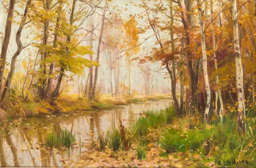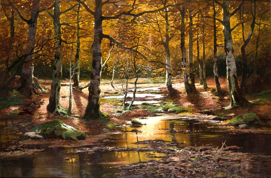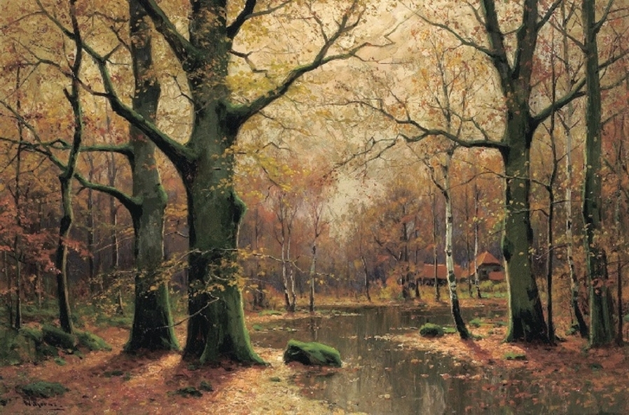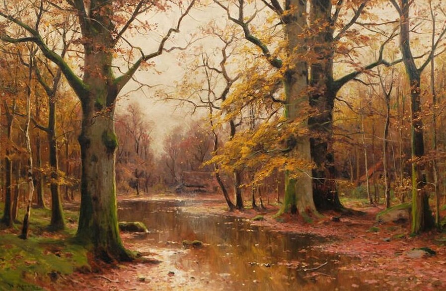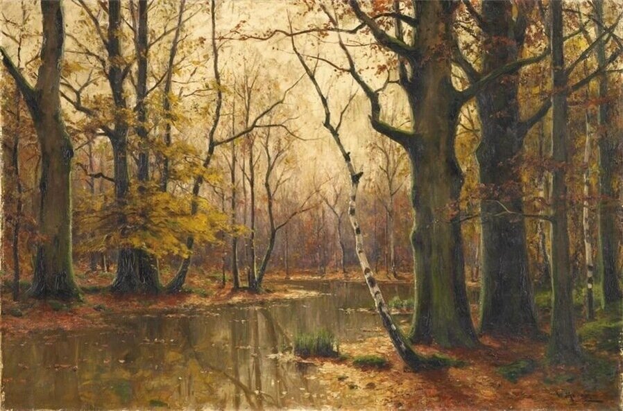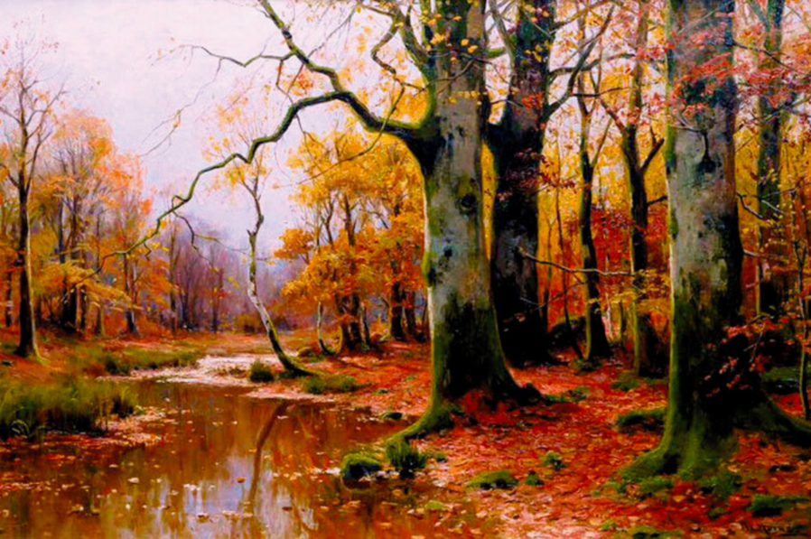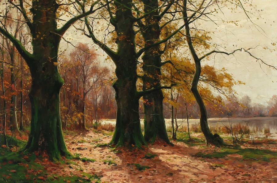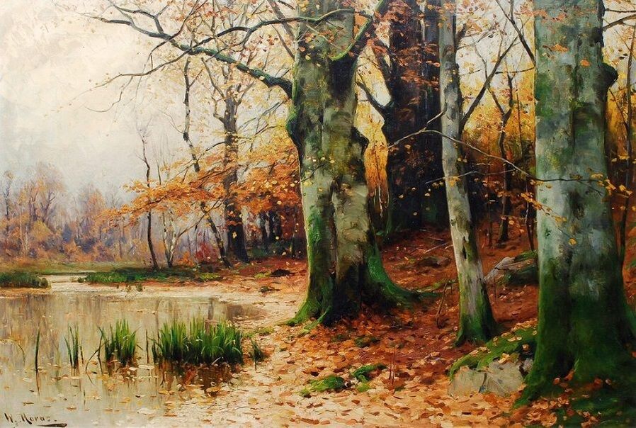 Все работы художников Moras здесь Художники Moras: Отец Вальтер Морас/Walter Moras (German, 1856–1925) АукционноОсеннеПейзажное (часть-2) Сегодня осень в дверь мне позвонила, Стояла на ступеньках и ждала. Я обомлела, когда Ей открыла, Такой она волшебною была! Копна волос красивых, ярко-рыжих, Точёный нос, румяность алых губ, И взгляд такой шальной от глаз бесстыжих, Сплошная ласка, кто здесь будет груб? Я ошарашено в дверях посторонилась, Она прошла и прямо вслед за ней, Такая красота вдруг ветром взвилась, Что не было её милей, родней… Мы пили чай вприкуску с листопадом, Всплакнули вместе проливным дождём. О, Осень — ты души моей отрада! Богат душой, кто осенью рождён… Когда она ушла, я очень долго Смотрела в дверь, не смея дверь закрыть! А с неба падал снег… На память только, Рябины грусть и образ, что нельзя забыть. (Лариса Рубальская)