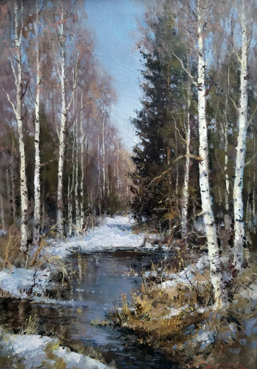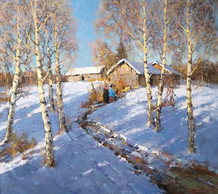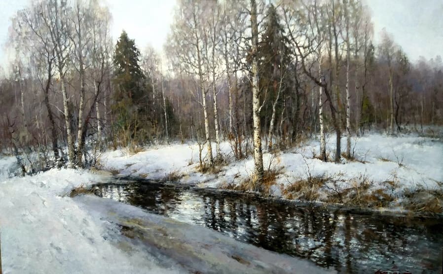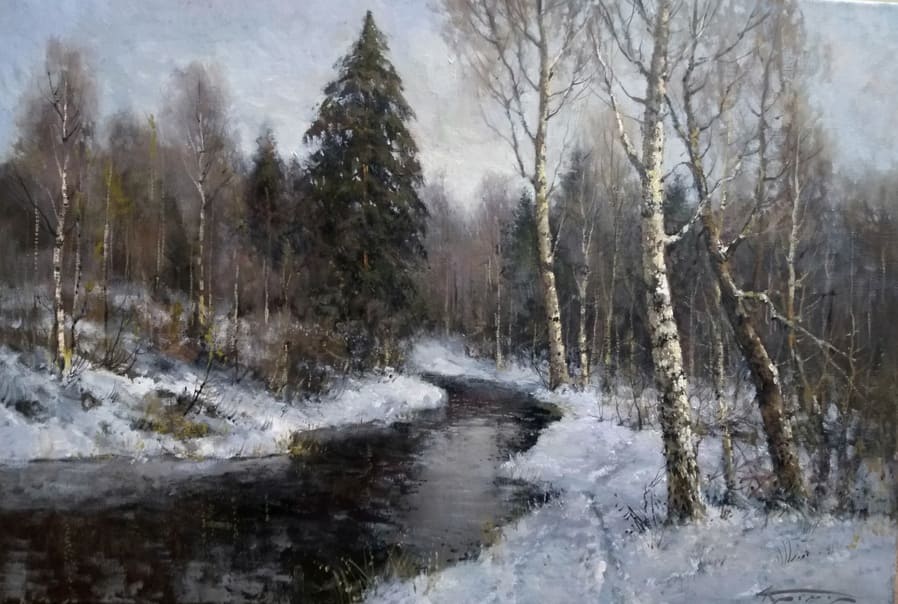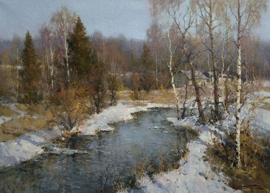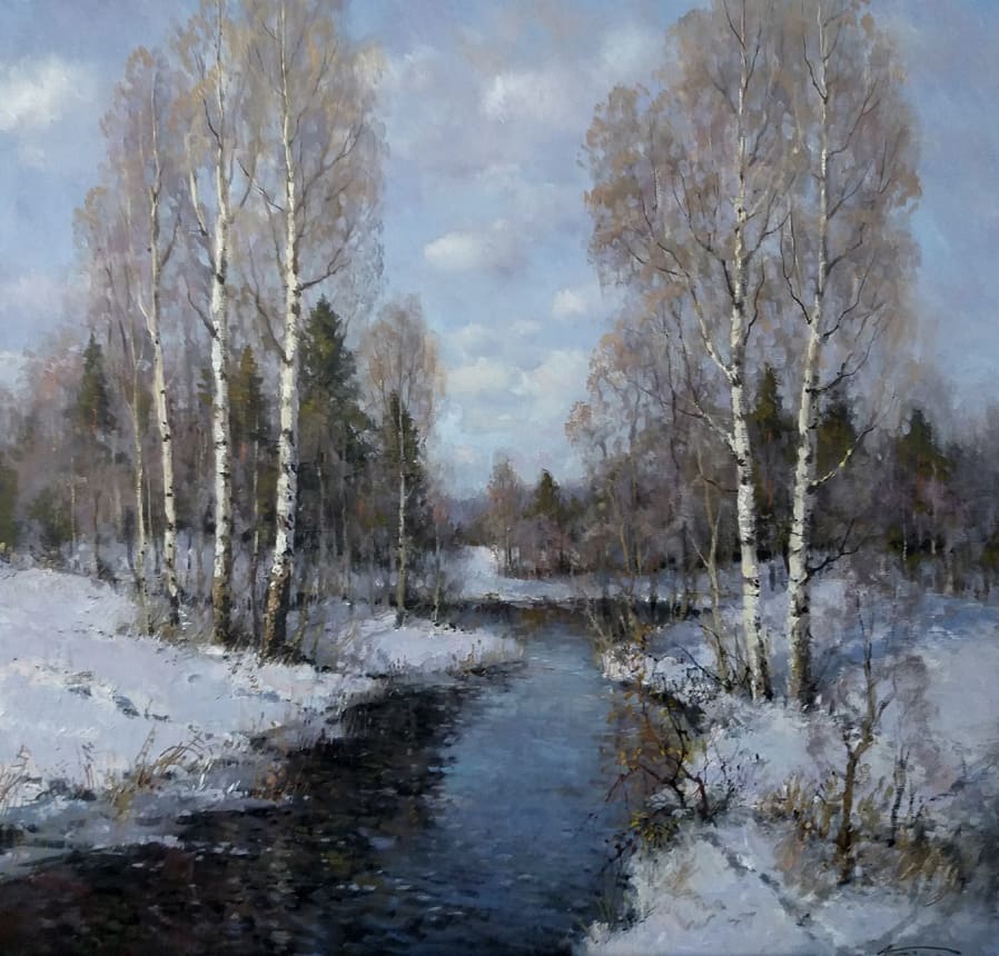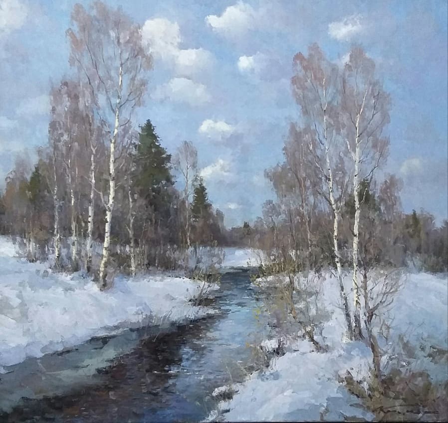 Все работы художников Кремер - здесь Династия художников Кремер: Александр Маркович Кремер (Россия, 1958) ВесеннеПейзажное (часть-4) Над деревней кружИтся снежок, Кое - где в окнах свет загорается. За околицей серый лесок С нетерпеньем весны дожидается. Лес тоскует по ярким цветам, Что ковром по весне расстилаются, И по солнечным тёплым лучам, Вся природа от них просыпается. Не слыхать в лесу щебета птиц, В край чужой улетели по осени. Навещают лес стайки синиц, Да и те в стужу лютую бросили. У колодца собрался народ Разговоры ведут о политике. Нелегко их деревня живёт, Не доходит до власти их критика. Нецензурная брань мужиков, То и дело до леса доносится, Да мычанье коров из хлевов, Попастись на луга видно просятся. В синем небе плывут облака, На зверушек различных похожие И казалось, что чья - то рука Начертила рисунки пригожие. Скоро, скоро наступит весна И предстанет пред нами красивая. Вмиг природу изменит она, Запоют ручейки говорливые. (© Copyright: Татьяна Комиссарова)