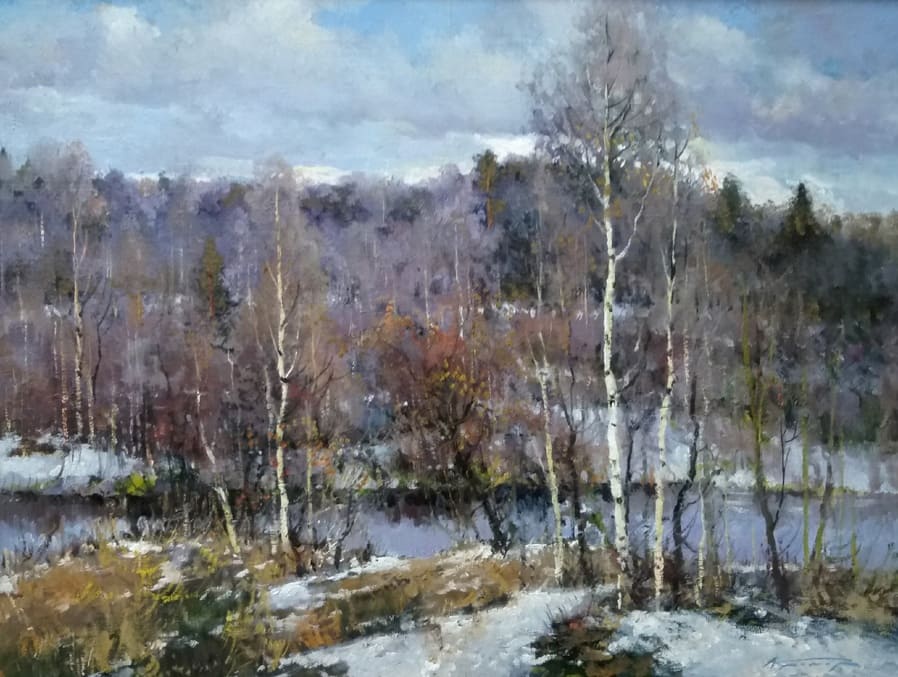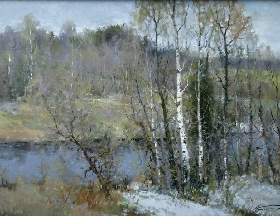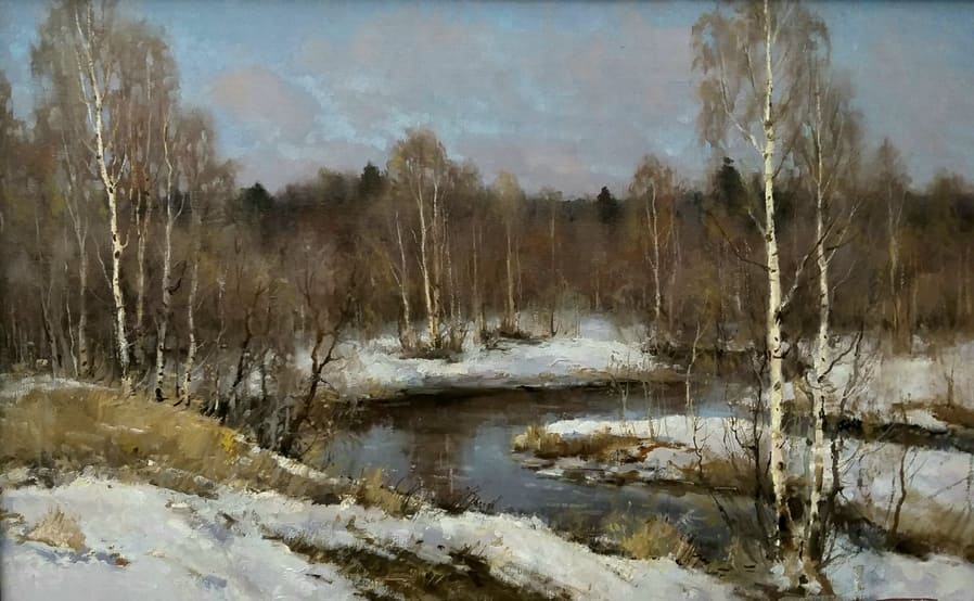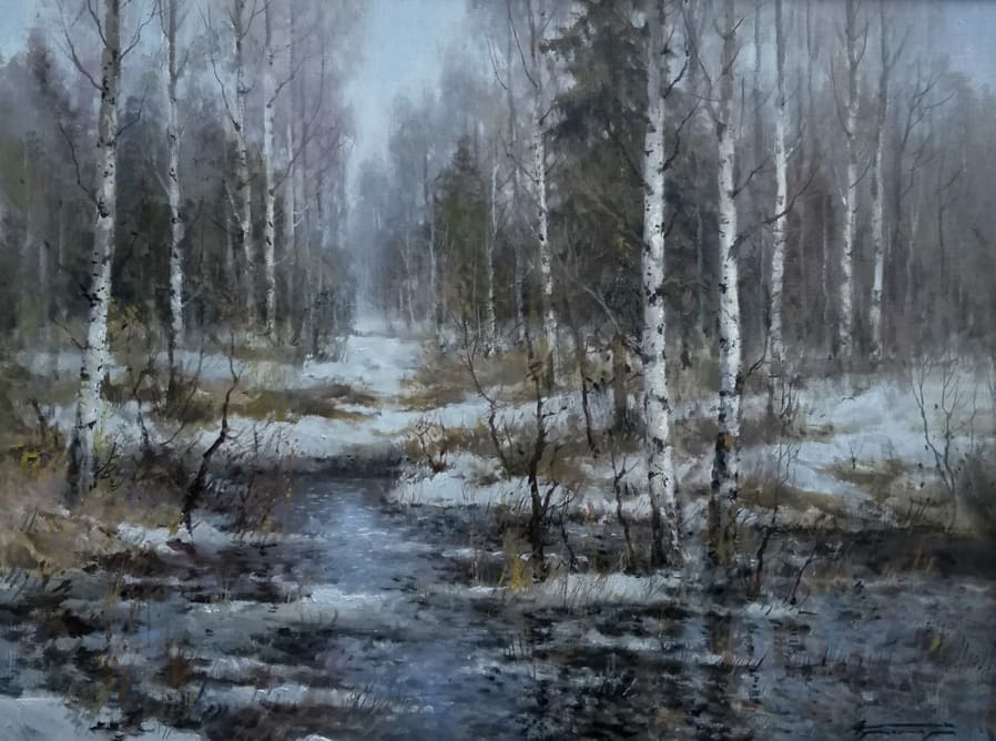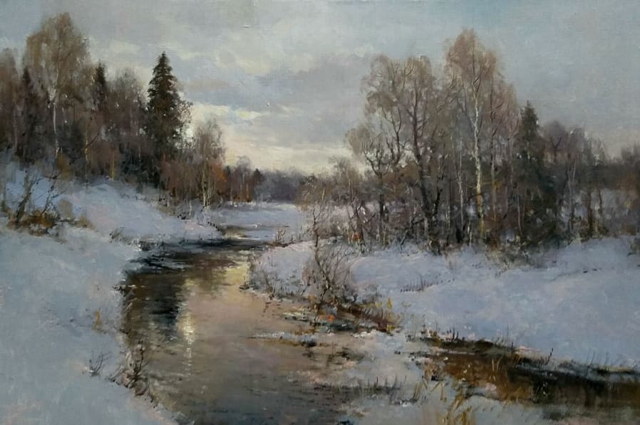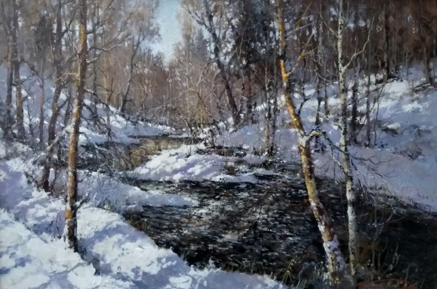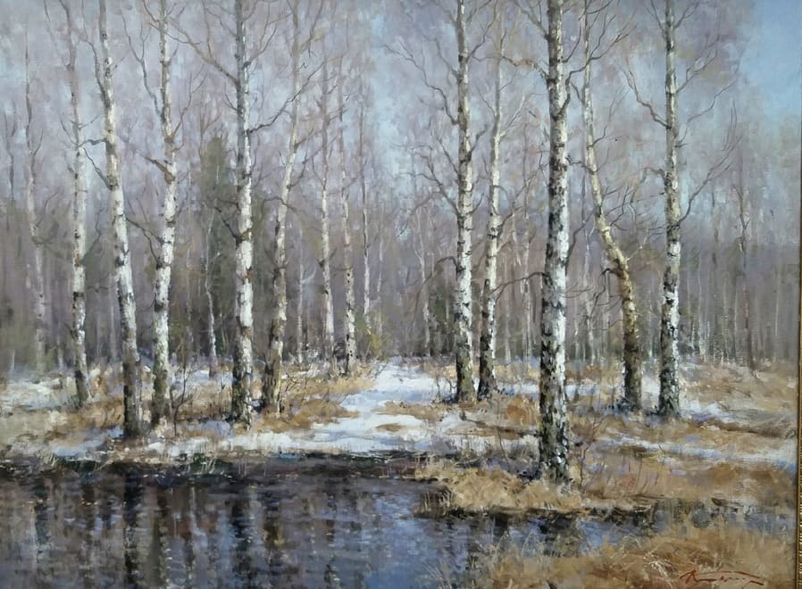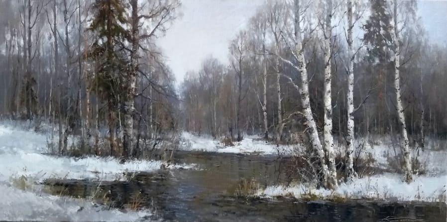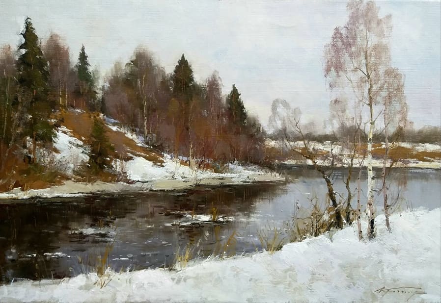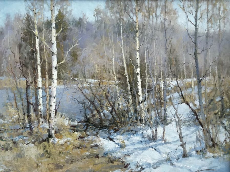 Все работы художников Кремер - здесь Династия художников Кремер: Александр Маркович Кремер (Россия, 1958) ВесеннеПейзажное (часть-4) Над деревней кружИтся снежок, Кое - где в окнах свет загорается. За околицей серый лесок С нетерпеньем весны дожидается. Лес тоскует по ярким цветам, Что ковром по весне расстилаются, И по солнечным тёплым лучам, Вся природа от них просыпается. Не слыхать в лесу щебета птиц, В край чужой улетели по осени. Навещают лес стайки синиц, Да и те в стужу лютую бросили. У колодца собрался народ Разговоры ведут о политике. Нелегко их деревня живёт, Не доходит до власти их критика. Нецензурная брань мужиков, То и дело до леса доносится, Да мычанье коров из хлевов, Попастись на луга видно просятся. В синем небе плывут облака, На зверушек различных похожие И казалось, что чья - то рука Начертила рисунки пригожие. Скоро, скоро наступит весна И предстанет пред нами красивая. Вмиг природу изменит она, Запоют ручейки говорливые. (© Copyright: Татьяна Комиссарова)