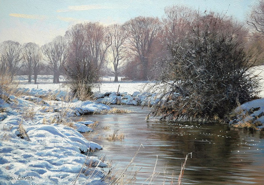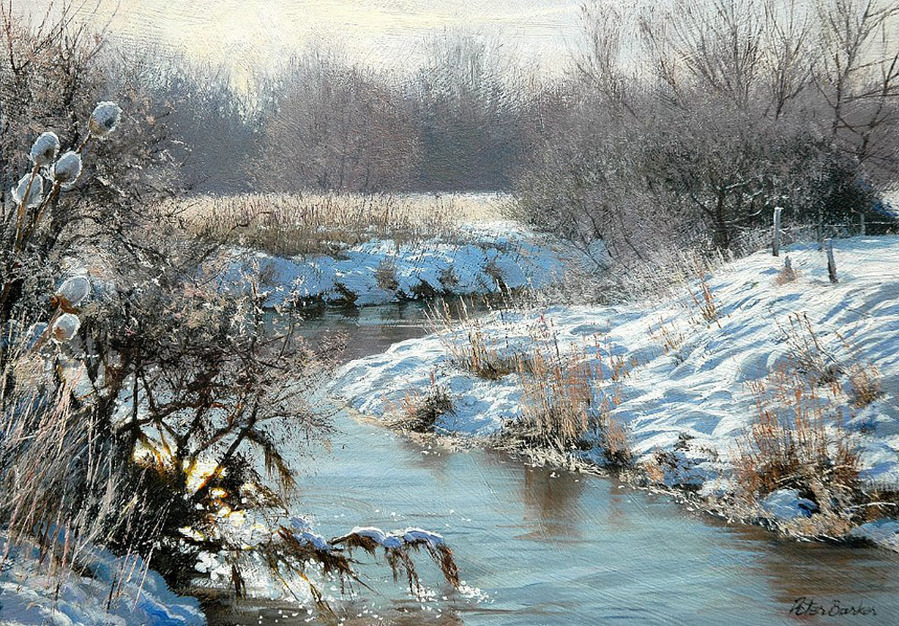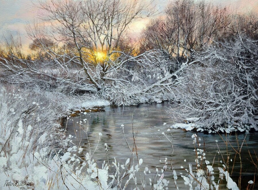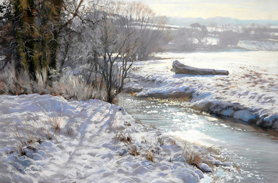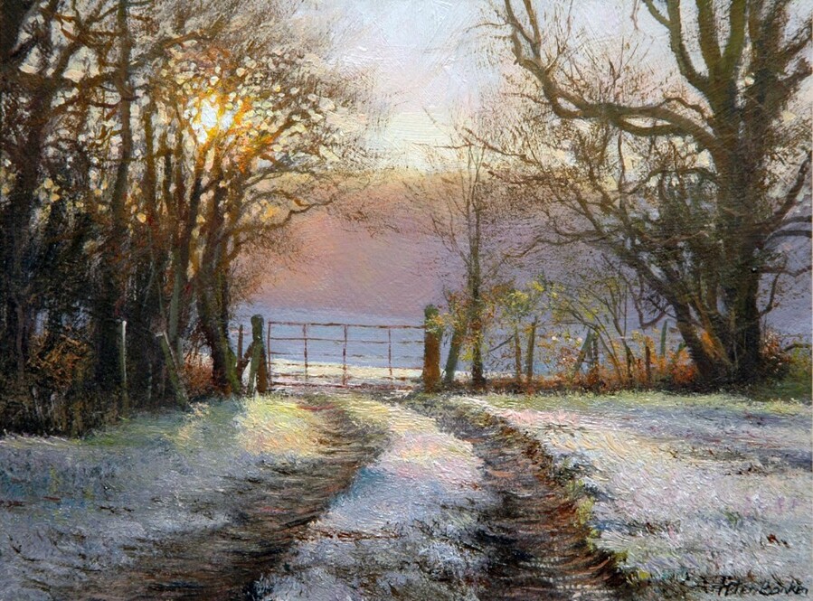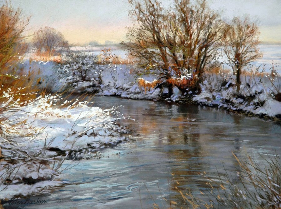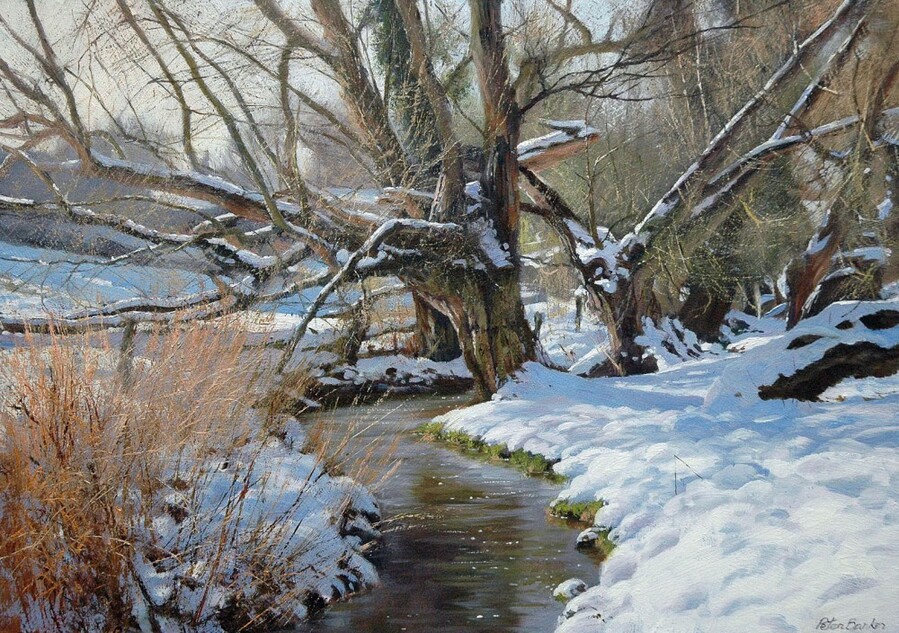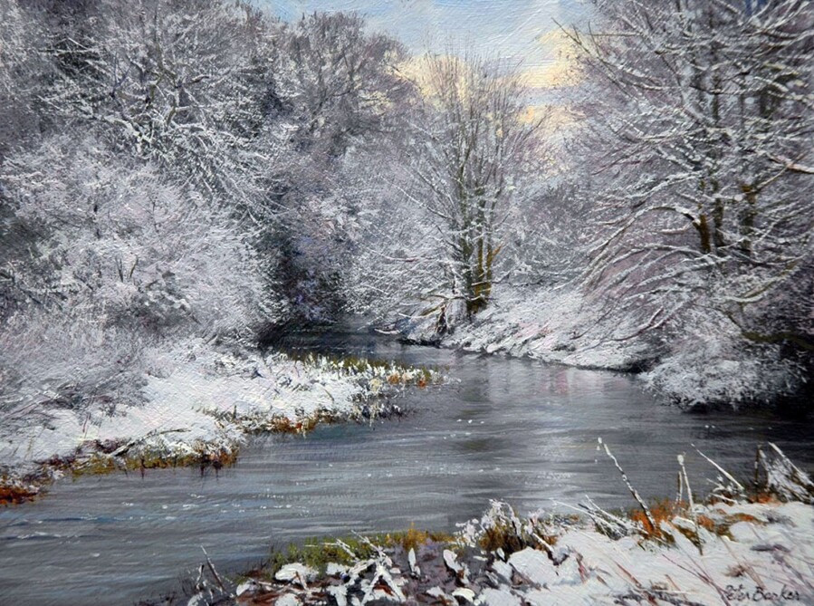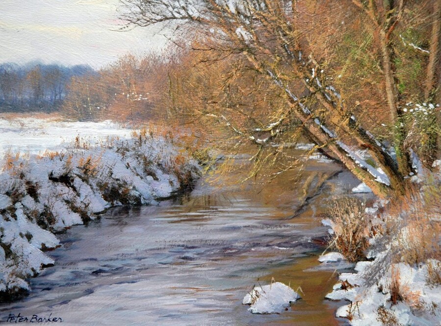 Питер пишет в основном маслом, а иногда пастелью и акварелью, и особенно известен своим реалистичным изображением воды и умение создавать поразительные изображения листвы и растительности деревьев с помощью 1-дюймовой кисти декоратора для сада и огорода.