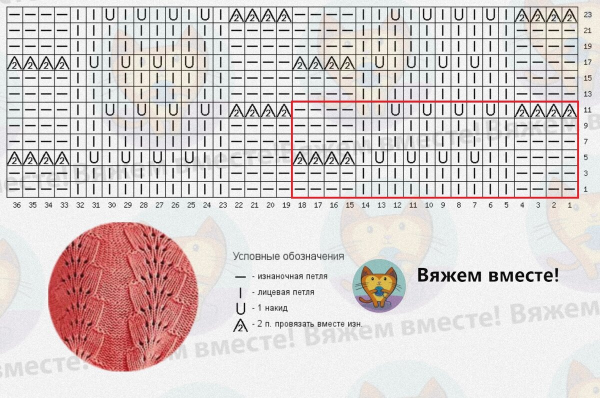 На схеме даны два раппорта узора по ширине и два по высоте, сделала так для большей наглядности. Один раппорт выделен красной рамкой и составляет 18 петель и 12 рядов.