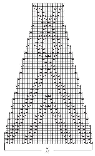 Наберите 218-230-242-262-282-302 п. на круговые спицы № 4 мм обеими видами пряжи (= в 2 нити) и провяжите 2 платочных ряда. В начале ряда закрепите 1 маркер - середина спинки джемпера. Вяжите по схеме A.1. Когда провяжете полный вертикальный раппорт узора A.1, перейдите на спицы № 5 мм и далее вяжите по схеме: 28-31-34-39-44-49 лиц., узор A.2 (= 53 п.), 56-62-68-78-88-98 лиц., узор A.2, 28-31-34-39-44-49 лиц. Когда провяжете полный раппорт узора A.2, у вас будет 150-162-174-194-214-234 п. Продолжайте вязать лицевой гладью, пока высота вязания не достигнет 44-44-44-45-45-45 см.