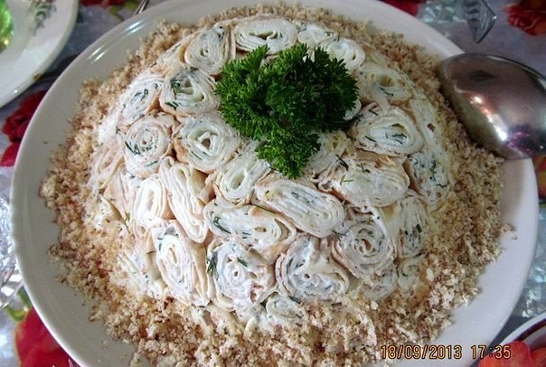 4. Салатник круглой формы выложить пленкой (чтобы края свисали) и плотно друг к другу выложить рулетики.