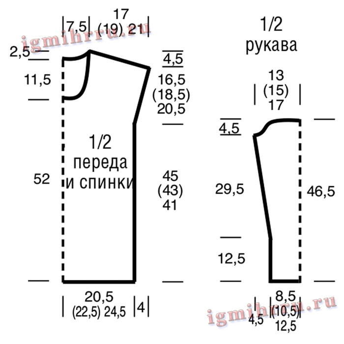 Перед: вязать, как спинку, но с более глубокой горловиной. Для этого уже через 52 см = 224 р. от наборного ряда закрыть средние 23 п. и обе стороны закончить раздельно. Для закругления горловины закрыть с внутреннего края 6 раз в каждом ряду и 5 раз в каждом 2-м ряду по 1 петле.