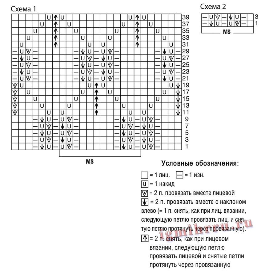 Ажурный узор: число петель кратно 12 + 1 п. + 2 кром. Вязать по схеме 1, на которой даны только лицевые ряды. В изнаночных рядах петли провязывать по рисунку, накиды – изнаночными. В ширину начинать с кром. и с петель перед раппортом, повторять раппорт, заканчивать петлями после раппорта и кром. В высоту выполнить 11 раз с 1-го по 4-й ряд, затем повторять с 1-го по 40-й ряд.