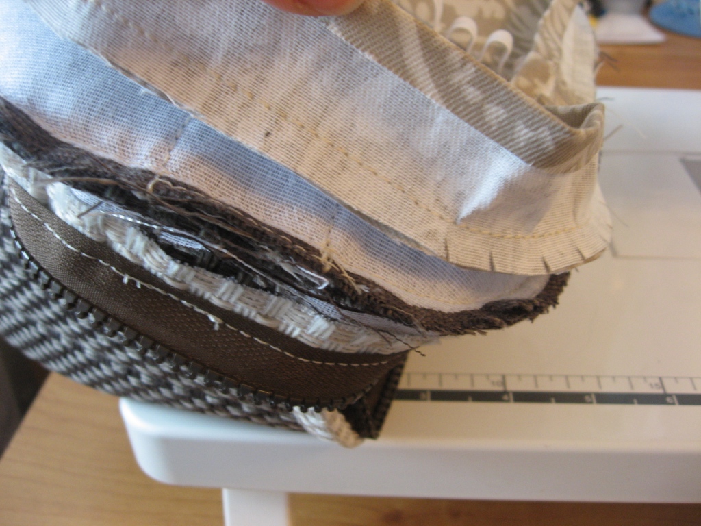 Подкладку косметички с карманами вставляем внутрь и подшиваем потайными стежками к молнии. Совмещение контрольных точек обязательно! Но бывает, что подкладку нужно подгонять по размеру. Как не пыталась я корректировать выкройку, все равно получается по-разному. Пришла к выводу, что при использовании разных материалов (толще-тоньше) и слоя синтепона, размеры меняются.