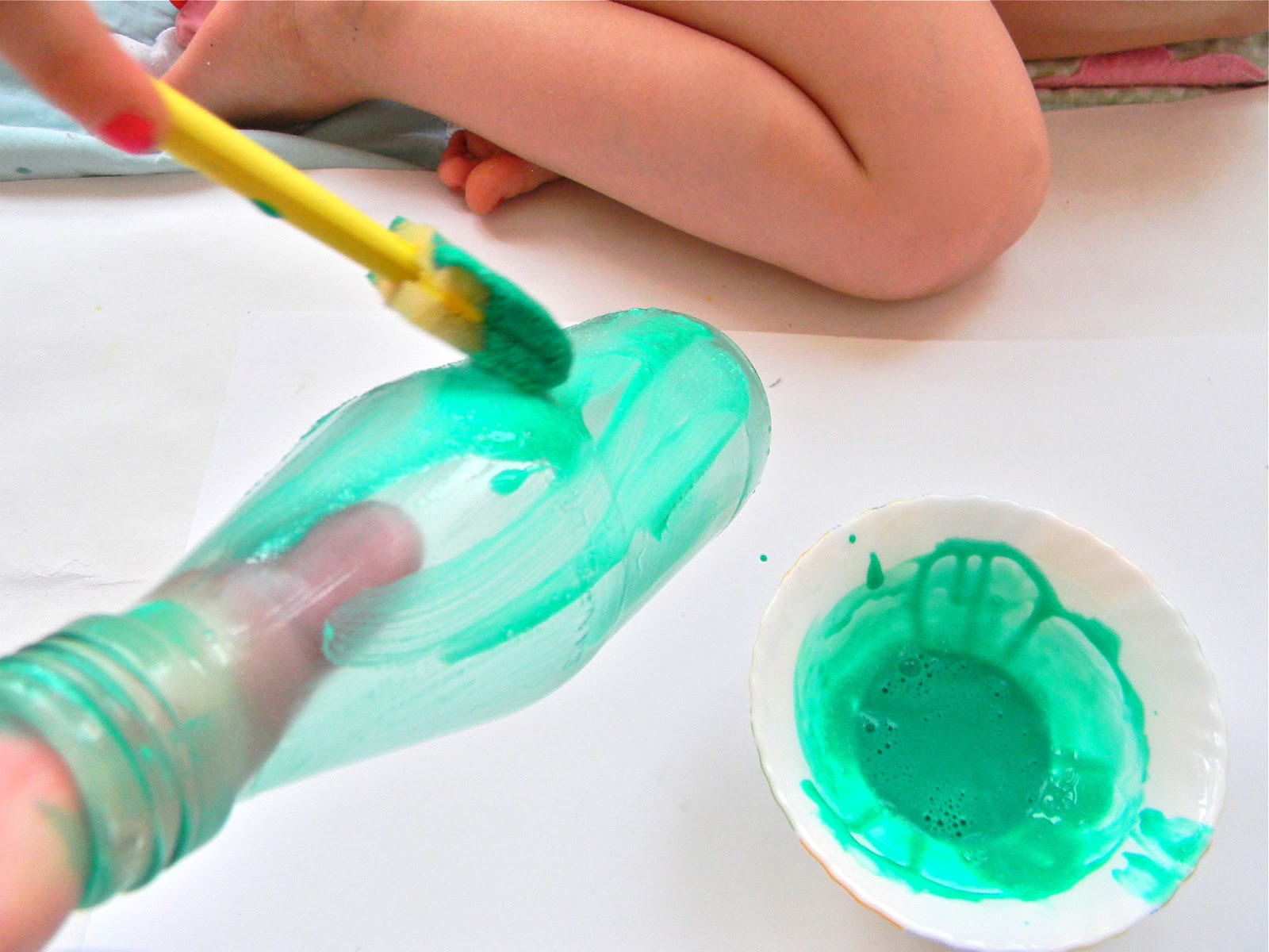 Затем берем большую кисть или такой спонж, как у меня на фото. Аккуратно покрываем бутылку снаружи со всех сторон. Стараемся, чтобы не было разводов. Можно дать ребенку раскрасить баночку для него, там можно потом хранить принесенные с улицы ветки или карандаши