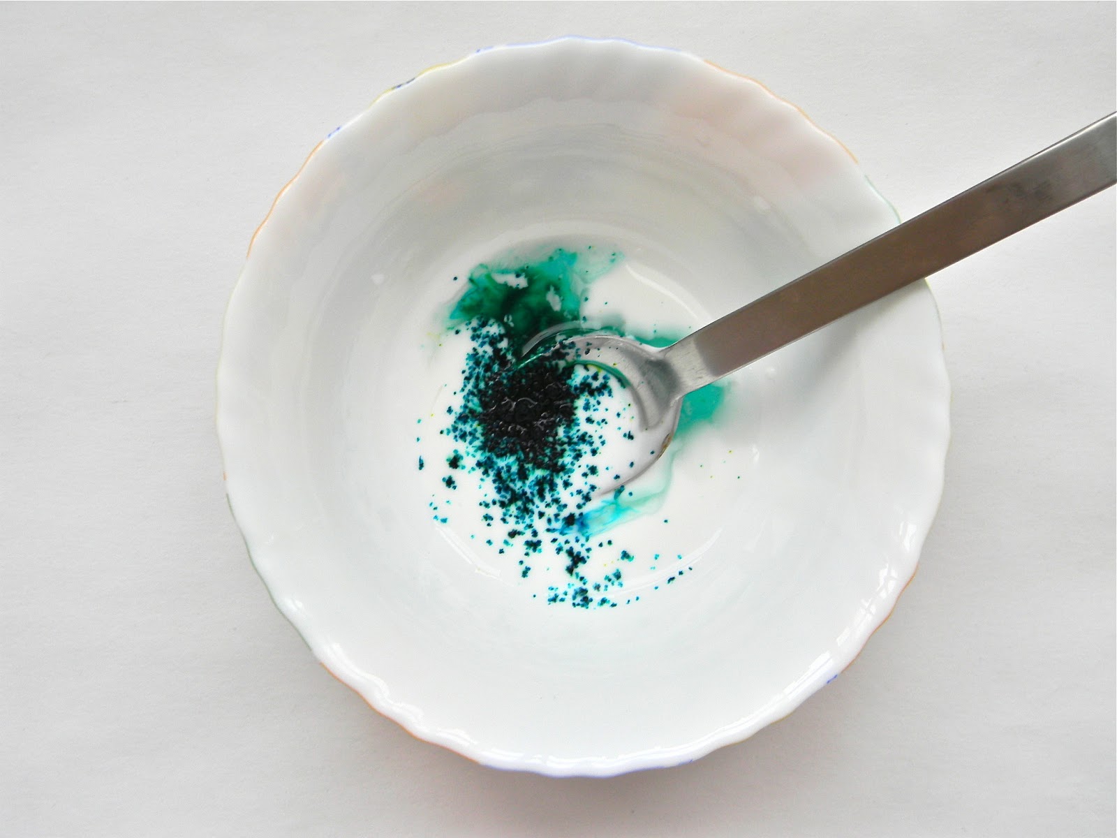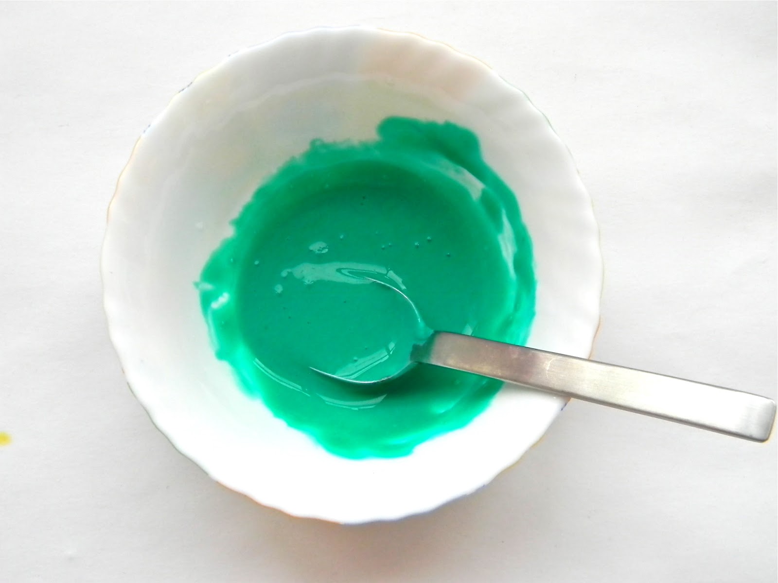 Затем добавляем пищевые красители нужного вам цвета. Я добавила бирюзовый. Если у вас нет бирюзового, то смешайте 3 капли синего красителя и одну каплю зеленого. Интенсивность цвета выбирайте сами. Можно проверить интенсивность цвета на бутылке, потом смесь смыть водой. Я хотела неяркую, нежную бутылку, поэтому красителя добавила немного. Высохшая бутылка будет светлее, чем смесь. Указанного количества смеси мне хватило на окрашивание 2-х бутылочек из-под детского сока "Фрутоняня" по 0,3 л, 2-х маленьких бутылочек из-под минеральной воды и одну 2-х л бутылку из-под слив