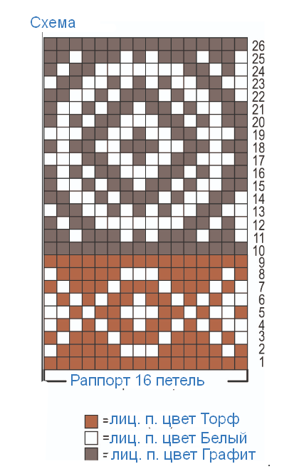 Начните вязать цветной узор со 2-го ряда схемы. Повторить 16 петель раппорта в ширину 5 раз. Провяжите ряды 3–26, затем повторяйте ряды 1–26.