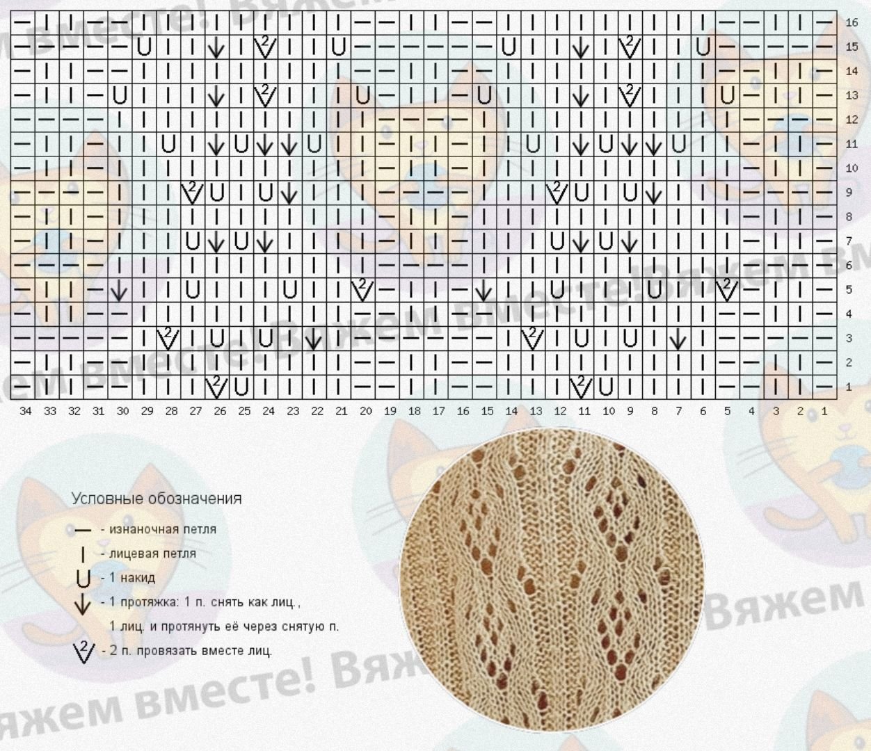 Скорее всего, вы уже заметили, что узор состоит из двух элементов: ажурный мотив и теневые дорожки, чередующие в себе лицевые и изнаночные ряды. Схема ниже полностью соответствует порядку комбинации элементов в оригинальной модели, просто берите и вяжите. Один повторяющийся блок составляет 34 петли и 16 рядов.