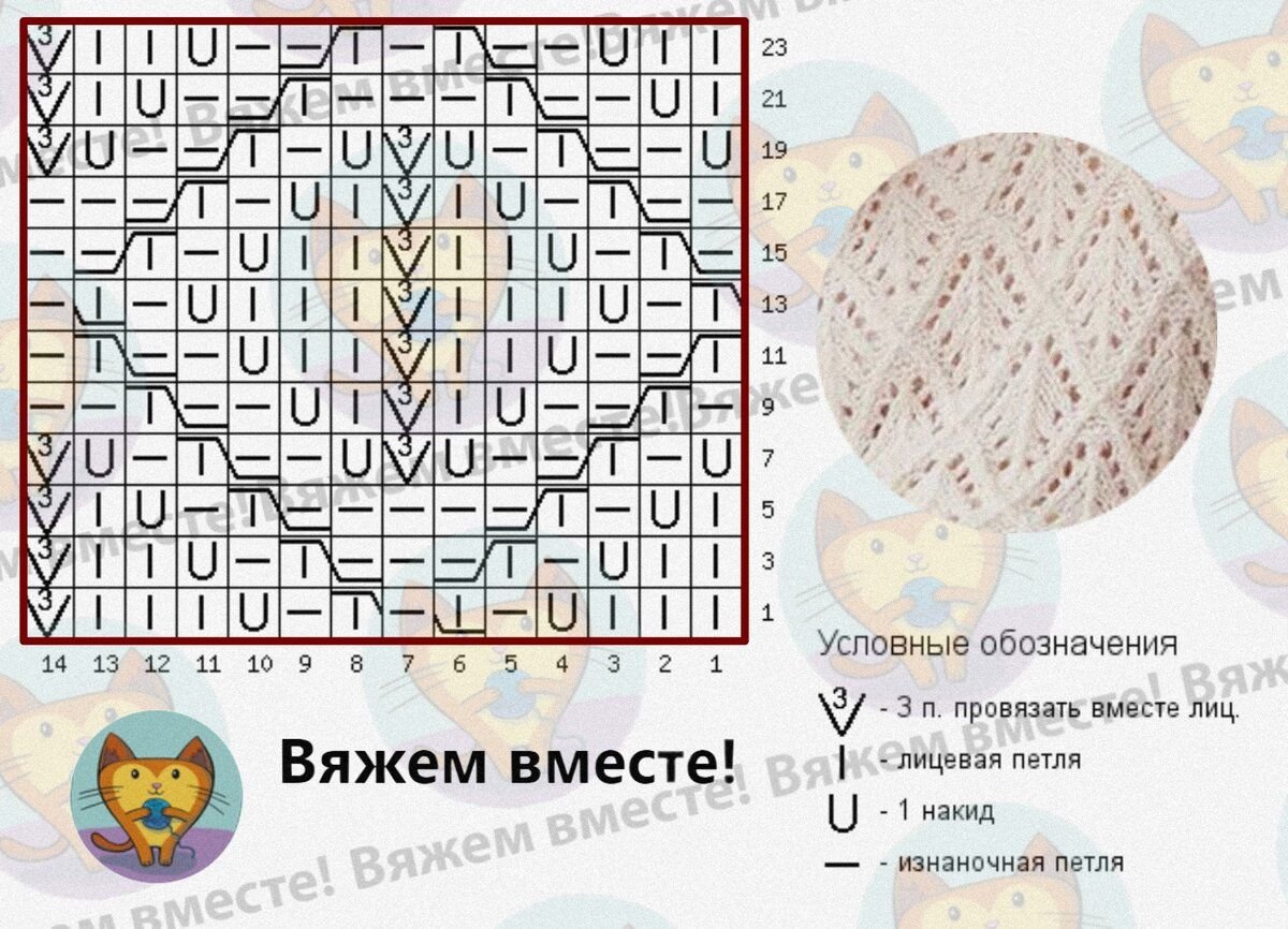 ❗Обратите внимание, 6-я, 7-я и 8-я по счёту петли в первом и 13-ом рядах вяжутся так: снять первую петлю на доп. спицу перед работой, 1 лиц., 1 изн., вернуть снятую петлю на спицу и провязать её лицевой.