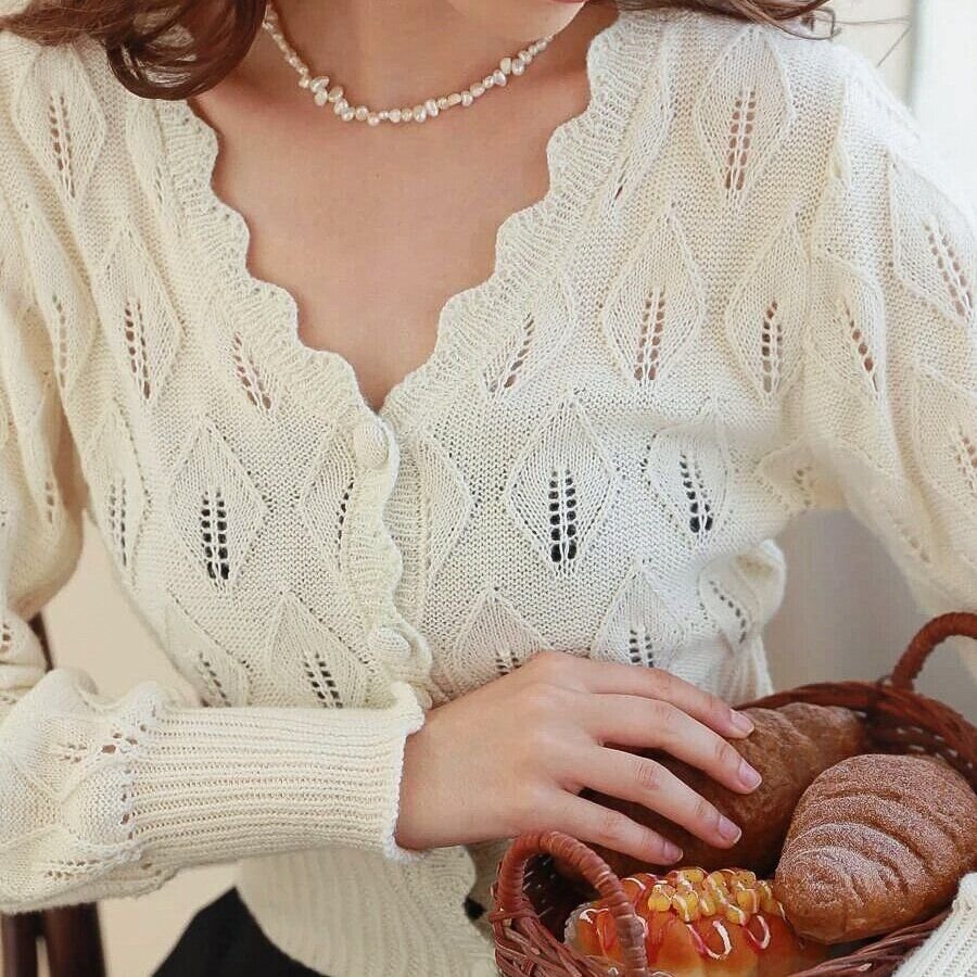 Очень понравилась модель кофточки на пуговицах с отдельно разбросанными по вязаному полотну на фоне изнаночной глади листьями. Особое внимание привлекает к себе волнистая планка, которую вполне можно повторить на спицах.