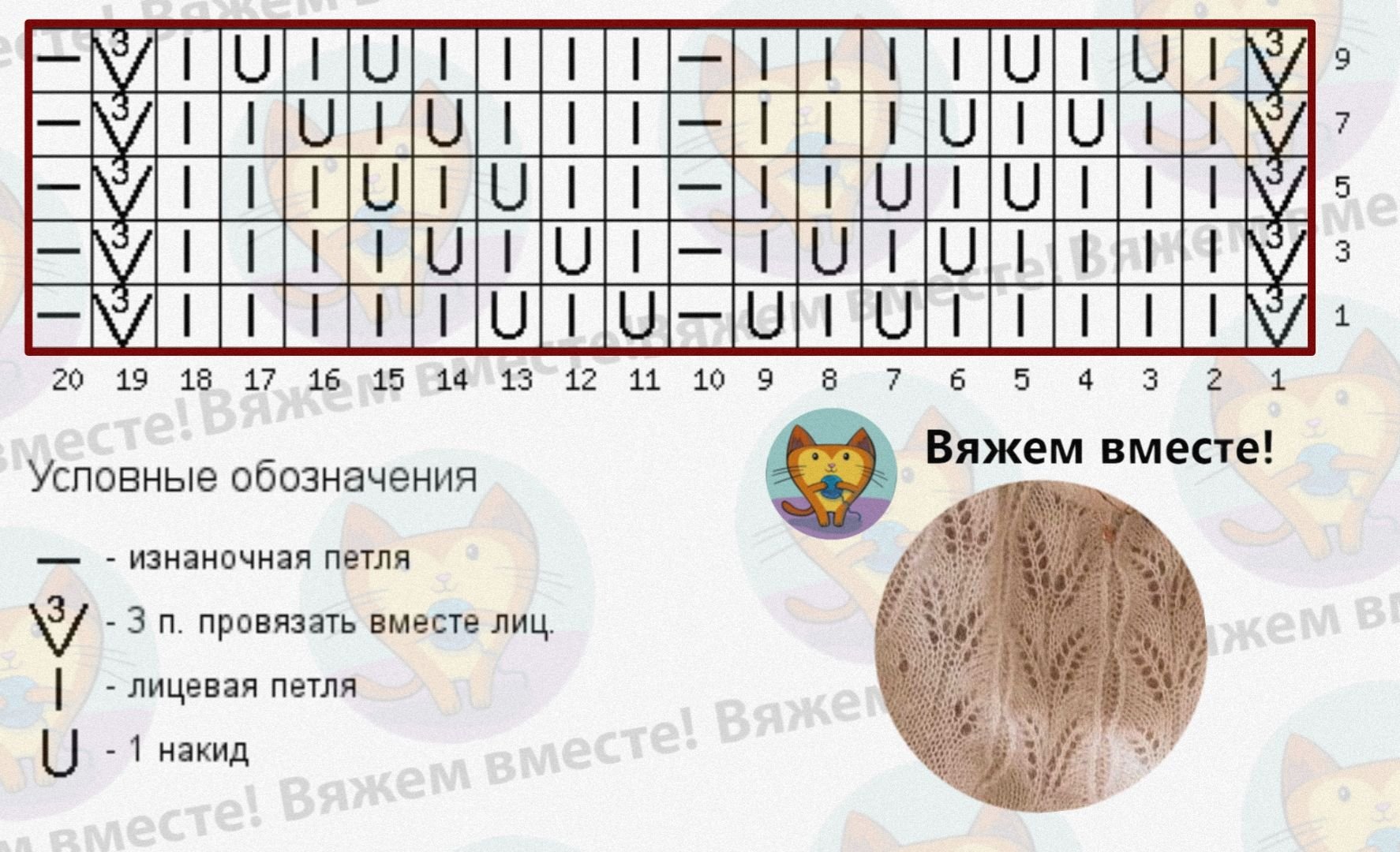 Схема узора. На схеме дан один раппорт узора (20 п. и 10 р.) и только лицевые ряды вязания, изнаночные вяжутся так, как лежат петли на спице.