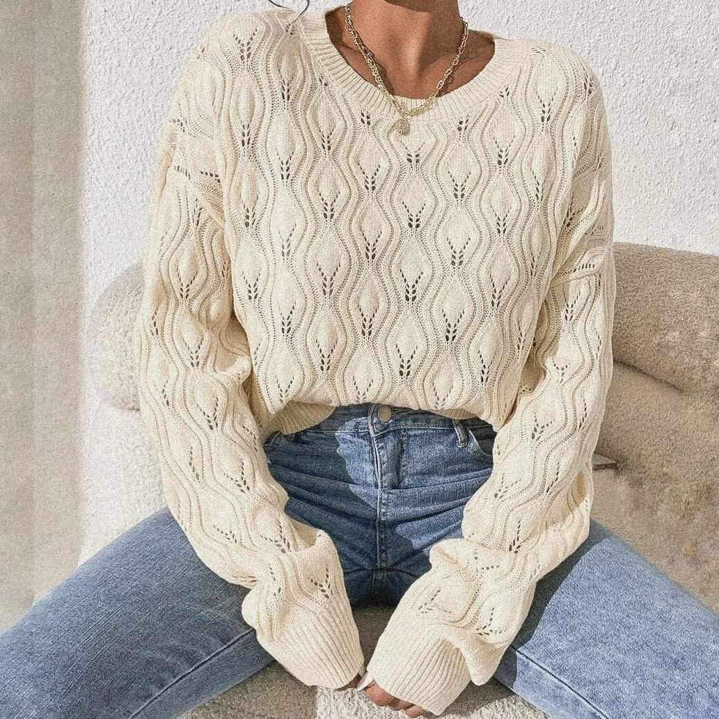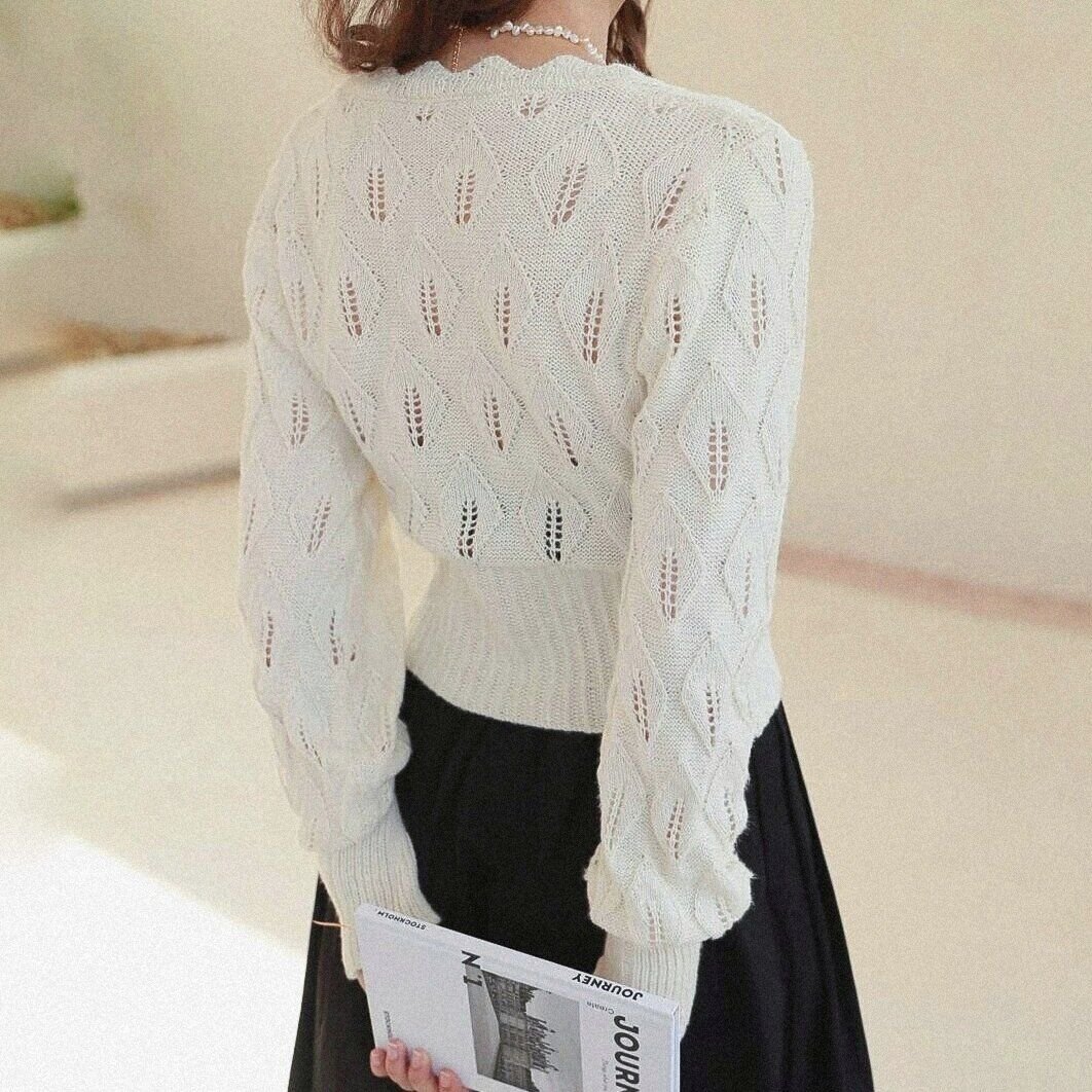 Ажурный узор в виде листьев придаёт этой простой вещи особый шарм, смотрится красиво и женственно.