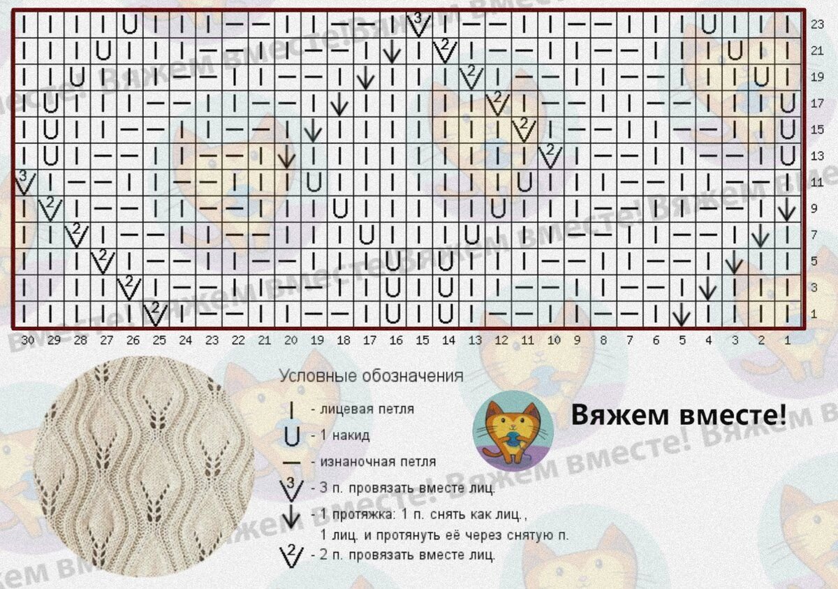 Схема узора. На схеме один раппорт узора, обозначен красной рамкой. Чётные ряды схемы вяжутся по рисунку петель на спице. Три петли вместе провязываются так, чтобы центральная петля лежала сверху.