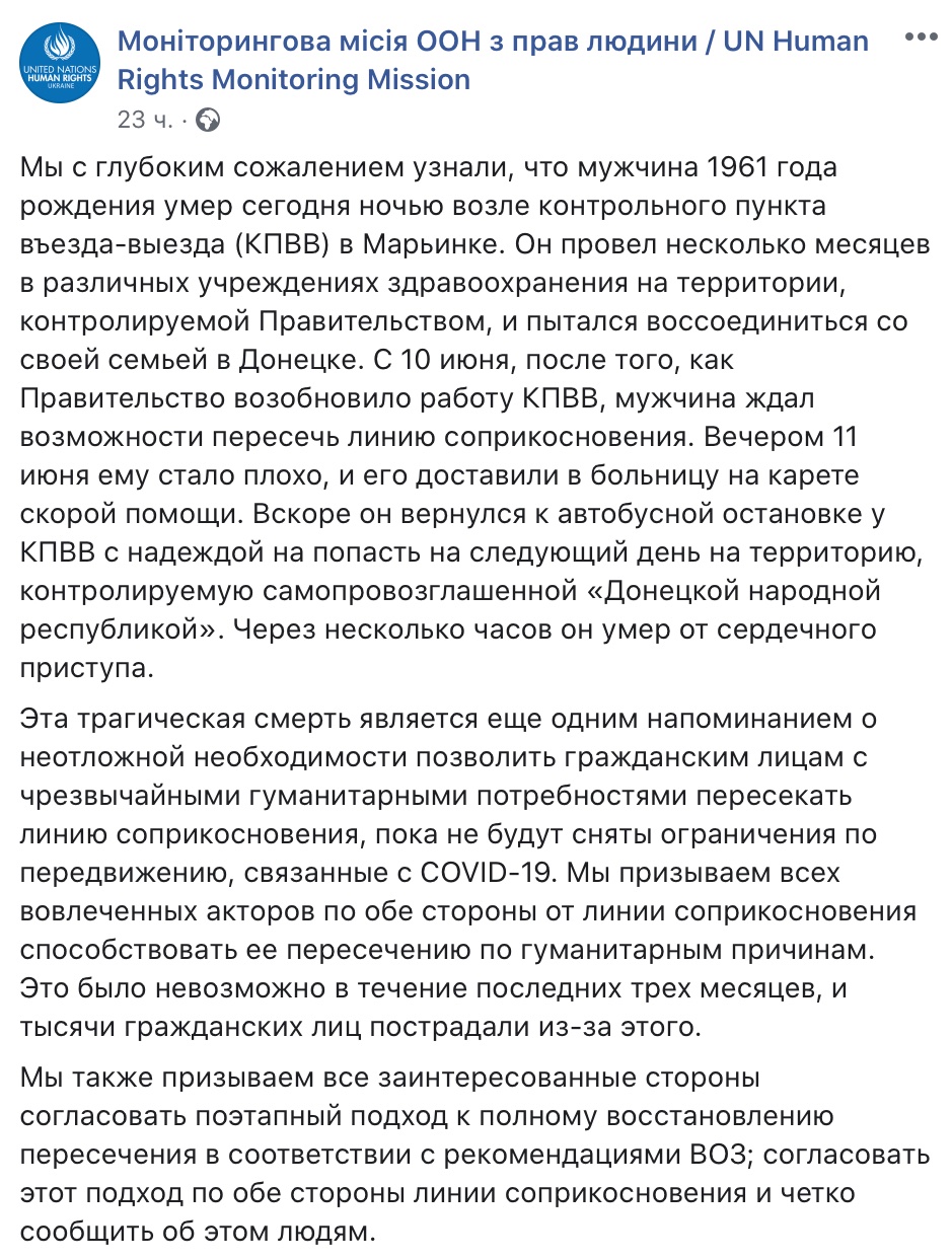 Сьогодні на КПВВ «Мар'їнка» помер чоловік. Йому було 59 років. Він прибув сюди ще 10-го червня — сподівався перетнути лінію розмежування.Тоді йому стало погано — швидка забрала чоловіка в Селидове, йому надали кваліфіковану медичну допомогу. Проте лишатися в лікарні він не захотів — повернувся на КПВВ. Вночі йому стало зле — він помер.