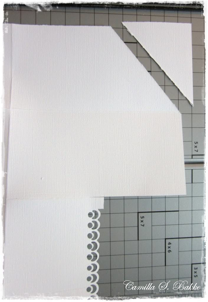 I first started with two sides, and cut off a bit, and then I used a borderpunch on the remaining part, so the edge looked nicer. Я начал с двух страницах, и отрезать немного, и я просто чрезвычайных границы штампа на оставшейся Стороны, то край выглядел лучше. Then I started with the two other sides. Тогда я начал с двух других сторон. First I cut of a triangle. Сначала я разрезе треугольник. I then took the cut-off part and placed it on the other side, so the side would look the same -only opposite from eachother. Я просто догнал отсечения партии и поставил его на другую сторону, так что стороны будет выглядеть то же самое, только противоположных друг от друга.