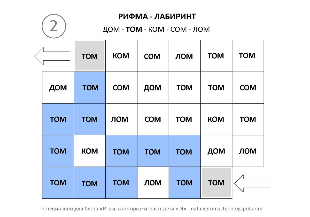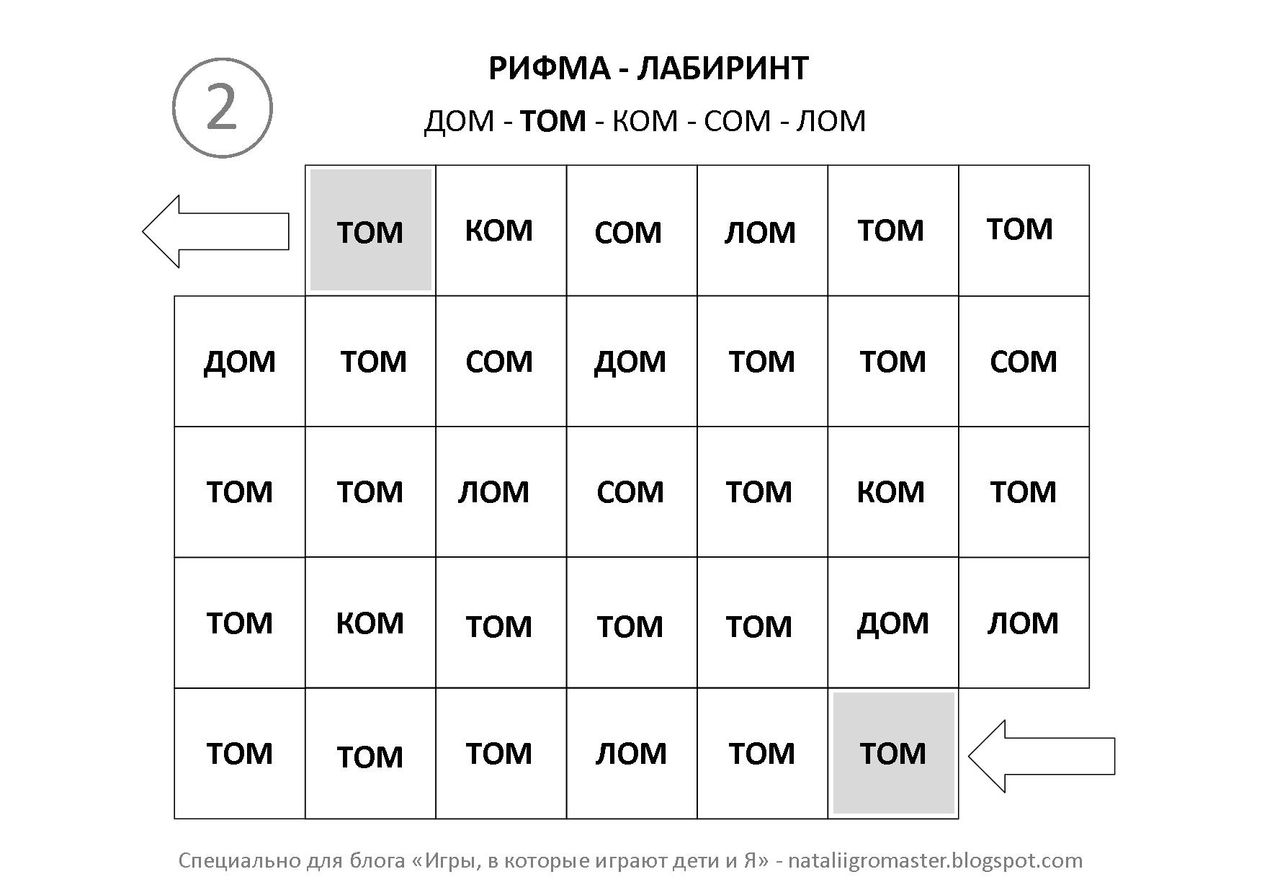 Задание: пройти по лабиринту, "шагая" по клеточкам с одним и тем же словом. Заданное слово в серых клеточках на входе и выходе.