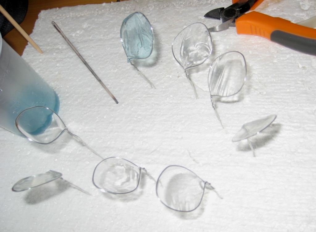 3. Что значит волнистая? Край контура волнистый? Делаете плоскую деталь, заливаете эпоксидкой, через 12 часов (частичная полимеризация смолы) снимаете с поверхности и придаете проволоке изгибы. Эпоксидка в этот момент достаточно пластичка, что бы гнуть и проволку и самой поверхности придать какие-то впуклости-выпуклости. Еще через 12 часов смола полностью полимеризуется и лепескти становятся жесткими.