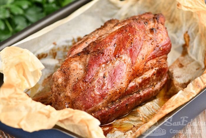 9. Затем буженину открываем. Посмотрите, какая она красивая. И сока на дне почти нет, а значит он внутри мяса. Аромат у мяса потрясающий. Если подаем буженину в горячем виде, то сразу ее нарезаем и подаем. Если готовили ее для мясной нарезки, то полностью ее остужаем на столе, затем заворачиваем в фольгу (пергамент), выдерживаем 1-2 часа в холодильнике и потом нарезаем на тонкие ломтики.
