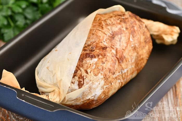 6. Заворачиваем в один слой и закручиваем концы, как у конфеты. Перекладываем мясо в форму и запекаем в разогретой духовке при 180 градусах 1,5 часа.