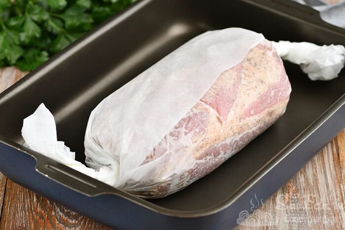 5. На большой кусок пергамента выкладываем кусок свинины (ближе к краю).