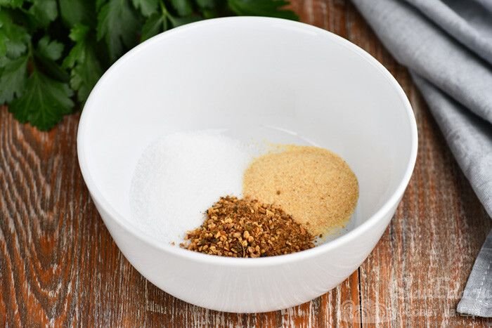 2. В миску высыпаем нитритно-посолочную смесь (нитритная соль 0,6%), сушеный чеснок и смесь перцев. Перемешиваем. Нитритная соль поможет сохранить красивый цвет мяса, а еще она усиливает вкус. Можно готовить и без нее, но мясо в разрезе будет серого цвета.