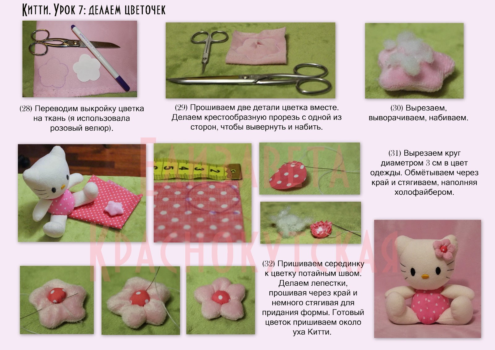 Знаете, любимые игрушки можно также шить в стиле мишек Тедди. Вот вам пример популярной игрушки сшитой именно таким образом. Все детали собираются с помощью шарниров, поэтому ваша Kitti сможет принимать любые позы и даже поворачивать голову влево и вправо. Шить игрушку лучше всего из флиса или белого велсофта. Глазки лучше использовать пластиковые (найти их можно во многих магазинах тканей или в Интернет-магазине). Носик можно сшить из кусочка жёлтой ткани. Платье сшейте из яркого мягкого материала, застежку на трех маленьких пуговицах сделайте на спине. Обратите внимание, что выкройка платья дана одна - для передней части цельная, для спинки, состоящая из двух частей. На платье сделайте аппликацию в виде большого цветка.