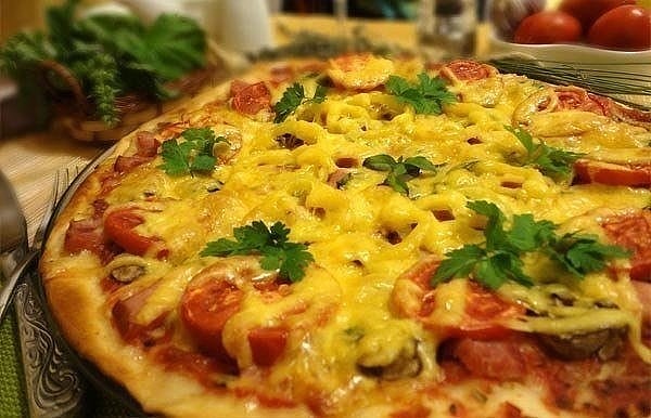 Ингредиенты: Для тонкого теста: - 100 гр. теплой воды; - 0,5 ч.л. сухих дрожжей; - по 1 чайной ложке сахара и соли; - 2 стакана просеянной муки; - 1 яйцо; - 2 ст. л. оливкового масла. Для начинки: - Томатный соус (100 гр. помидоров, оливковое масло, сухой базилик, орегано, соль, сахар); - 100 гр. помидоров; - 100 гр. ветчины; - 120 гр. сыра; - 50 гр. болгарского перца; 100 гр. свежих шампиньонов. Приготовление: 1. Замесите тесто: растворите в теплой воде сахар, сухие дрожжи и соль. 2. Всыпьте половину муки, размешайте и добавьте яйцо, еще раз хорошо размешайте массу. 3. Добавьте остальную муку, оливковое масло и вымесите тесто. 4. Разделите тесто напополам: из каждой половинки вы сможете приготовить пиццу диаметром 35-40 см. 5. Раскатайте тесто в виде круглого тонкого блина, по мере необходимости подсыпая муку. 6. Приготовьте томатный соус: 2-3 средних помидора ошпарьте кипятком и удалите кожицу, измельчите их в блендере, добавьте щепотку сухого базилика и орегано, оливковое масло, сахар, соль. Проварите соус 5 минут, и дайте немного остыть. 7. Всю площадь теста намажьте томатным соусом. 8. Выложите нарезанные грибы, ветчину, сладкий перец, помидоры, посыпьте натертым сыром и зеленью. 9. Поставьте пиццу на 15-20 минут в заранее разогретую до 220 градусов духовку. Важно: не передерживайте ее в духовке, иначе тесто не получится мягким!