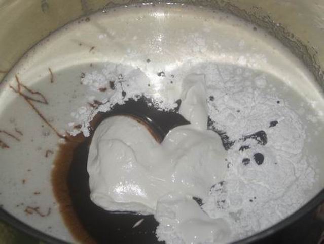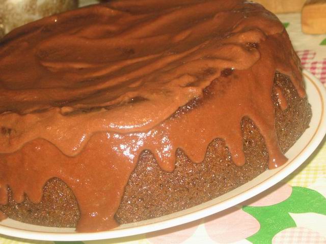 Заливаем его приготовленной глазурью: 10 гр сметаны нагреваем, добавляем 3 столовые ложки какао и 2 столовые ложки сахара. Доводим до кипения, помешивая, кипятим 1-2 минуты.