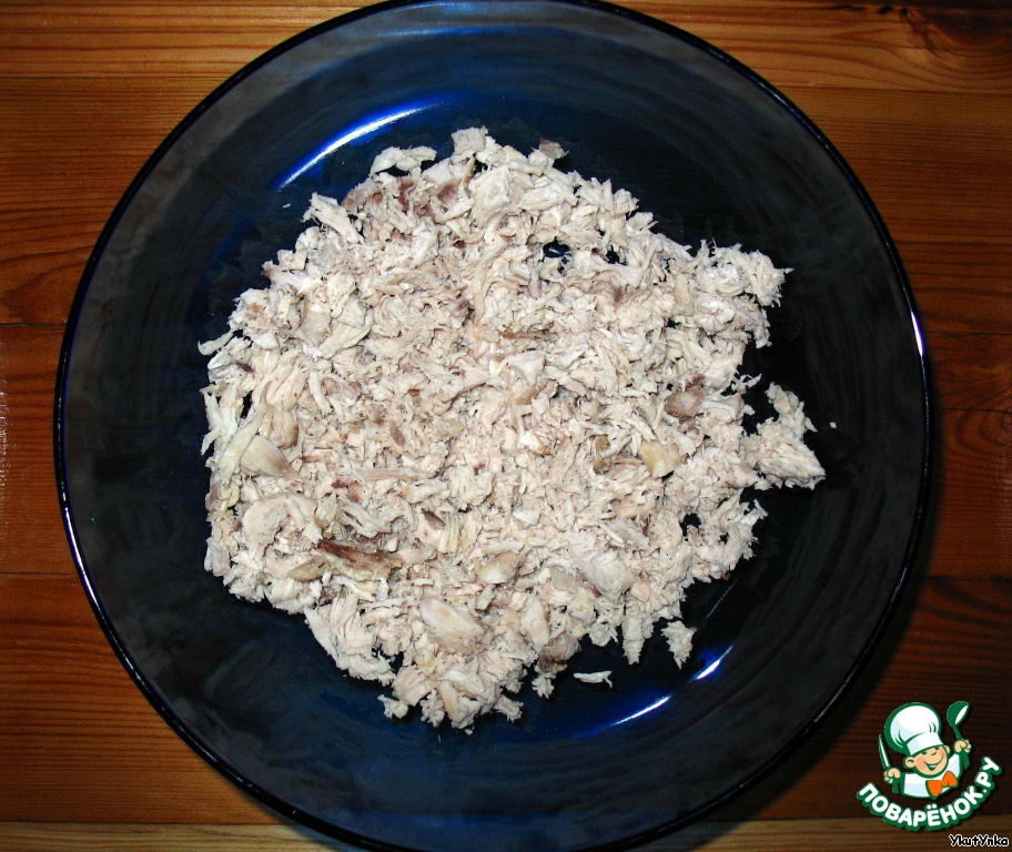 1 слой: мелко нарезаем куриную грудку, укладываем на дно миски и смазываем майонезом. |