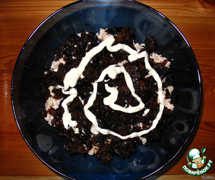 2 слой: чернослив разрезаем на 4-6 частей и смазываем майонезом. |