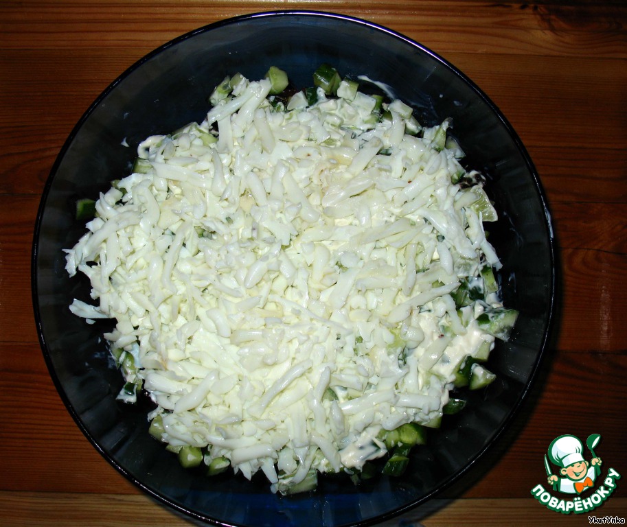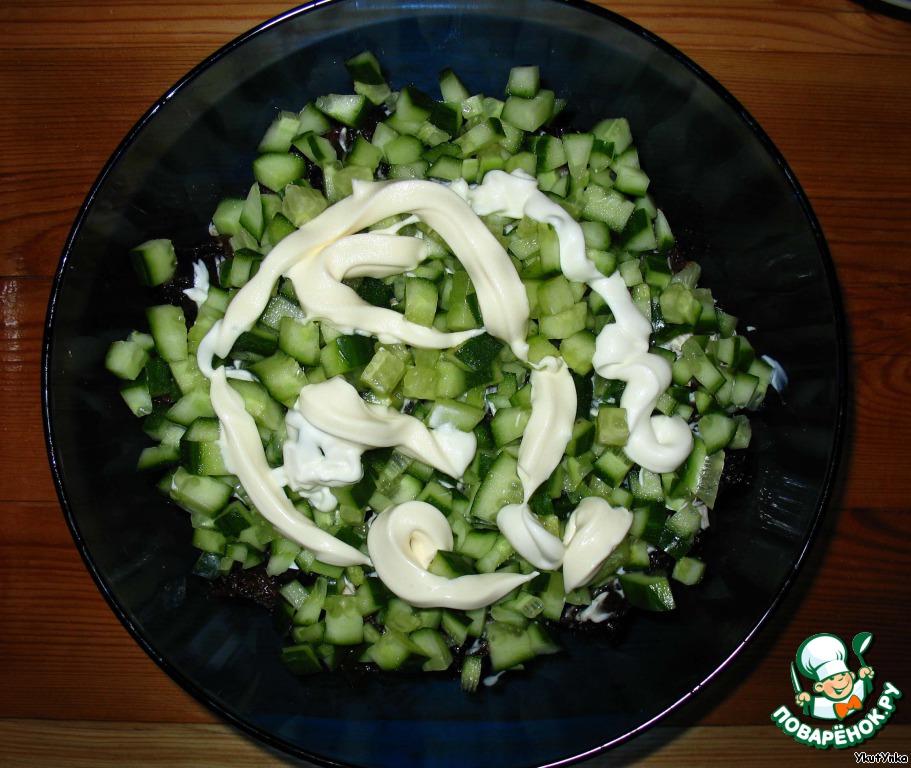 3 слой: огурец мелко нарезать, (можно на терке), немного посолить и смазать майонезом. |