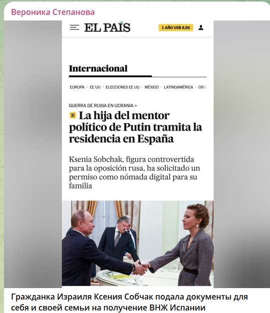 "Ксения Собчак… оформляет вид на жительство в Испании для себя и своего сына… Франция выдала Собчак пятилетнюю визу, позволяющую свободно передвигаться по странам Шенгенской зоны, после чего она приехала в Испанию, чтобы подать заявление на постоянное проживание", - пишет издание El Pais.