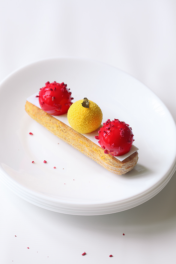 Оба мусса достать из сферических формочек. Шарики мангового мусса покрыть жёлтым велюром, а клубничные шарики, при помощи зубочистки, по очереди окунуть в красный гляссаж. На охлаждённые эклеры выложить тонкие пластины из белого шоколада, на них - муссовые шарики. Клубничные заглазированные шарики посыпать измельчённой сублимированной клубникой, а манговые шарики задекорировать кусочками пищевого золота.