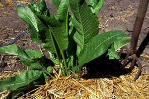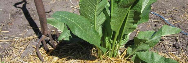При пожелтении нижних листьев, корни хрена можно выкапывать. Копать хрен удобней при помощи вил.