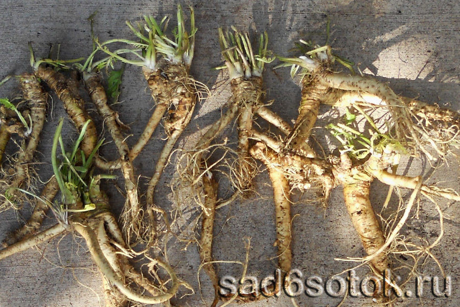 Черенки заготавливают осенью во время уборки урожая. Боковые отростки или «паук» обрубают от основного корня. Из всей массы отбирают тонкие, здоровые корешки длиной max – 25 см и диаметром 0,8 — 1,2 см. Длинные черенки разрезают на несколько частей. Верхнюю их часть обрезают поперек, нижнюю – по диагонали или наискосок. Обрезку делают перед высадкой в грунт.