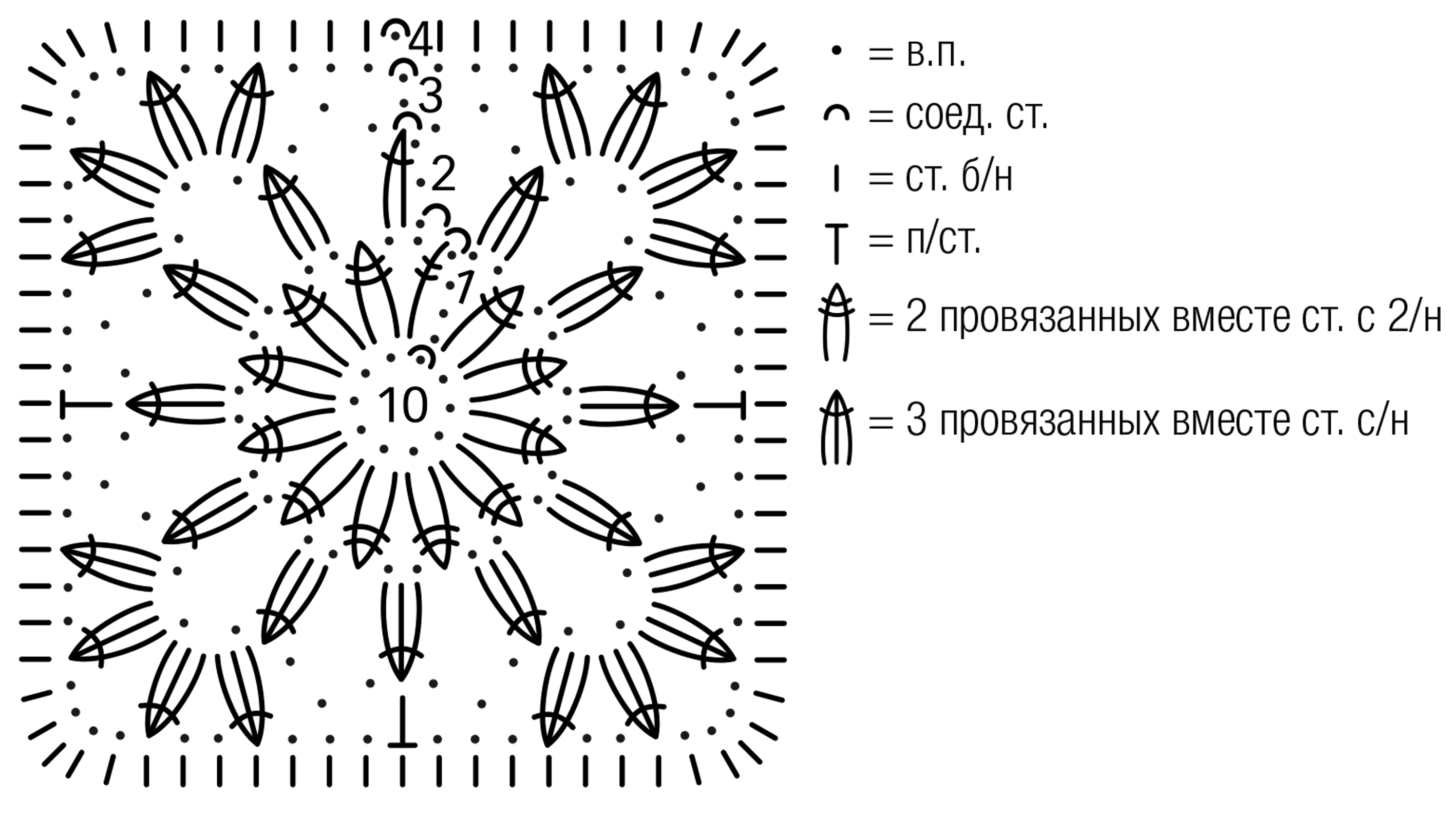 Вязать согл. схеме круговыми рядами. При этом каждый круговой ряд начать с указанного числа в.п. крючком указанной толщины для каждого размера и закончить 1 соед. ст. в указанную в.п.