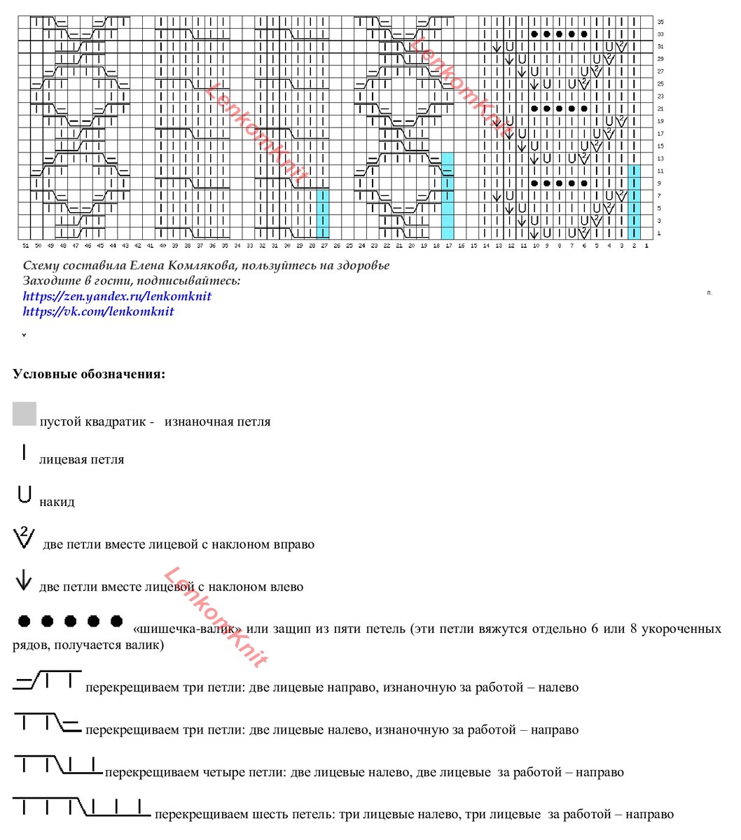 На рисунке - принцип вязания центральной части свитера. Жгут смещается направо и налево с помощью накидов с одной стороны и провязывания двух петель вместе с другой стороны жгута. На схеме две петли провязываются вместе после жгута или перед ним. Я бы в этом случае провязывала вместе две петли, "накрывая" первой (или, соответственно, последней) петлей жгута ту петлю, которую мы убавляем. Если делать так, убавки будут вообще не заметны.