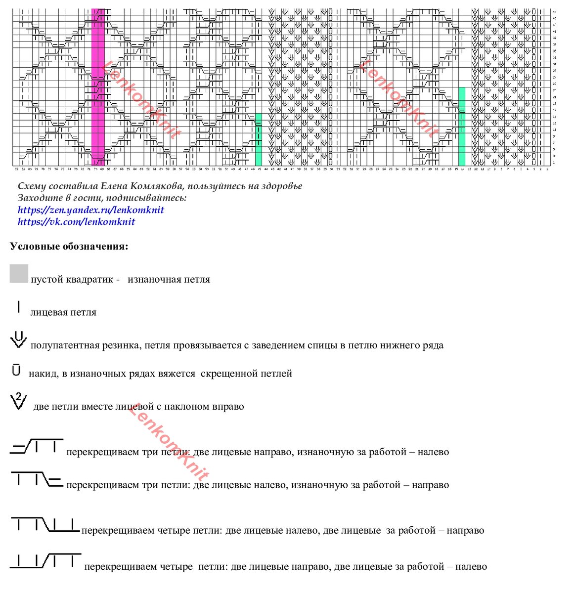 На рисунке - схема вязания узора. Раппорт в длину и ширину выделен зеленым цветом.