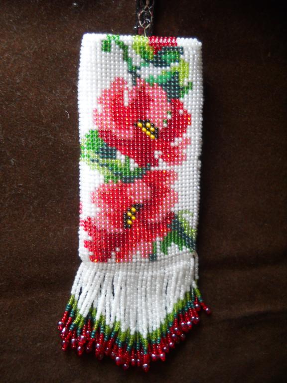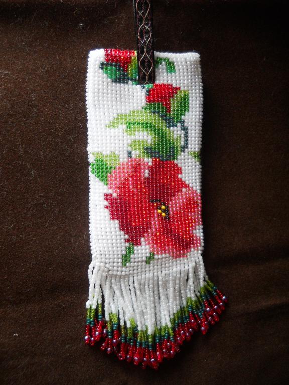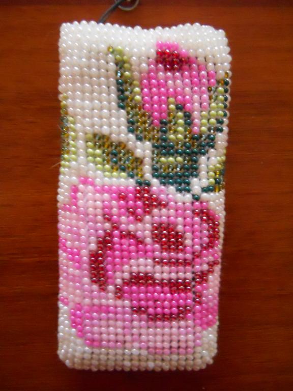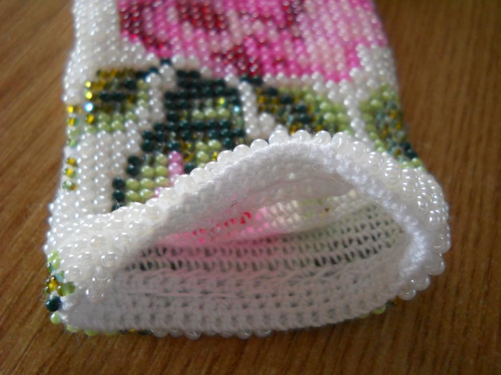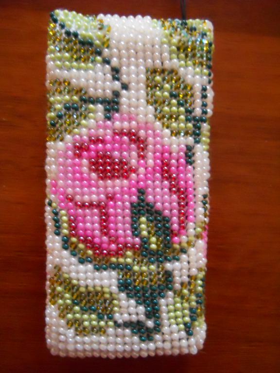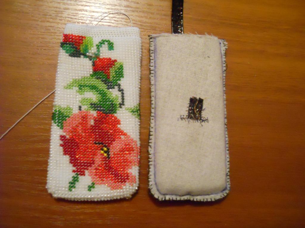 Третий этап. Набираю оставшуюся часть рисунка. Заканчиваю работу четырьмя рядами без бисера. Потом полученное полотно заворачиваю во внутрь и пришиваю. На практике замечено, что это очень удобно. Во-первых, телефон из чехла не выскакивает и нет необходимости делать затягивающую веревочку или ленточку. Во-вторых, край получается мягким и не царапает бисером телефон. Ну сам результат