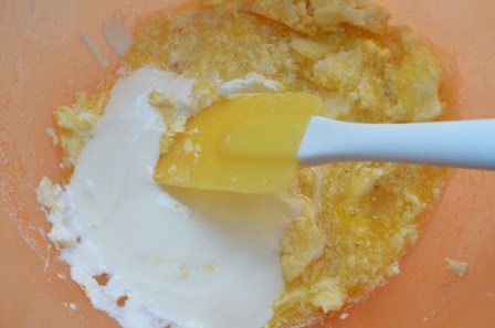 2. Добавить сметану, муку и разрыхлитель и вымешать тесто. По необходимости еще добавить муки, чтобы тесто было нелипким и гладким. Я вымешивала прямо в миске.