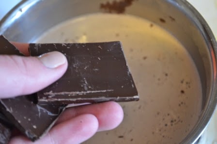 9. Добавляем поломанный на кусочки шоколад, растворяем его в этой массе. Варим постоянно помешивая до первых признаков закипания. Главное постоянно мешать, лучше деревянной ложкой и чтобы огонь не был сильным и все получится!